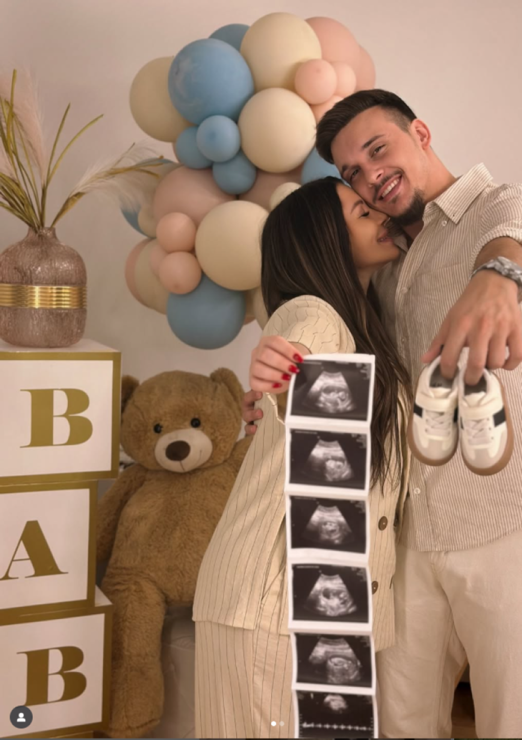 U pozadni se mogu videti plavi i roze baloni, a iako su budući roditelji sigurno već saznali pol deteta, tu informaciju nisu podelili sa javnošću.
