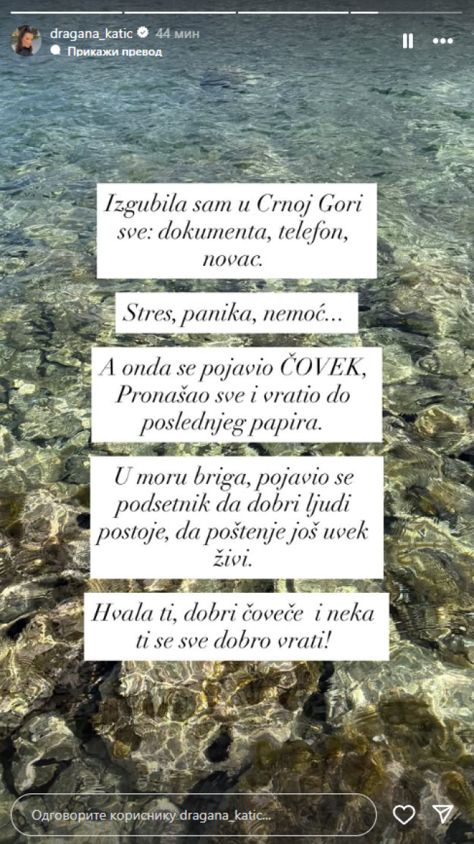 "Izgubila sam u Crnoj Gori sve - dokumenta, telefon, novac. Stres, panika, nemoć. A onda se pojavio čovek. Pronašao sve i vratio do poslednjeg papira. U moru briga, pojavio se podsetnik da dobri ljudi postoje, da poštenje je uvek živi. Hvala ti, dobri čoveče i neka ti se sve dobro vrati", napisala je Katićka.