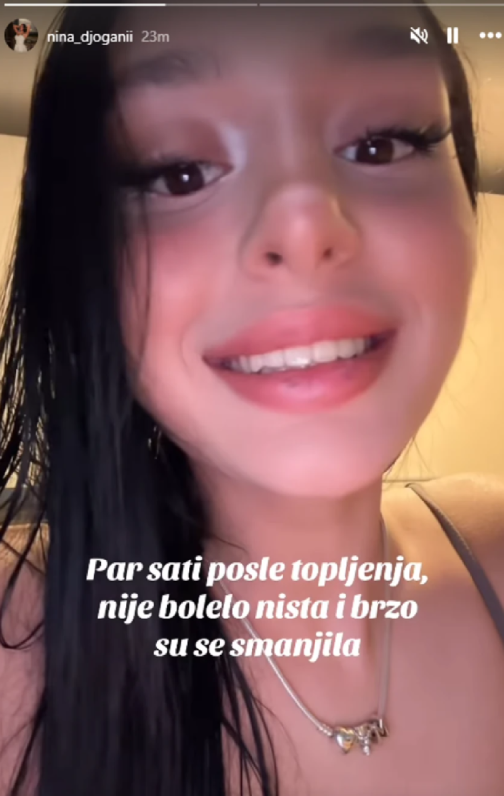 - Topljenje usana kod moje doktorke. Ovde smo otopili hijaluron koji je migrirao. Dugo sam htela da ih smanjim, jer su mi bila prevelika za moj ukus mojom krivicom. Par sati posle topljenja nije bolelo ništa i brzo su se smanjila. Ovo je rezultat, malo je otečeno, posle otoka su bila još manja kao što sam i tražila.