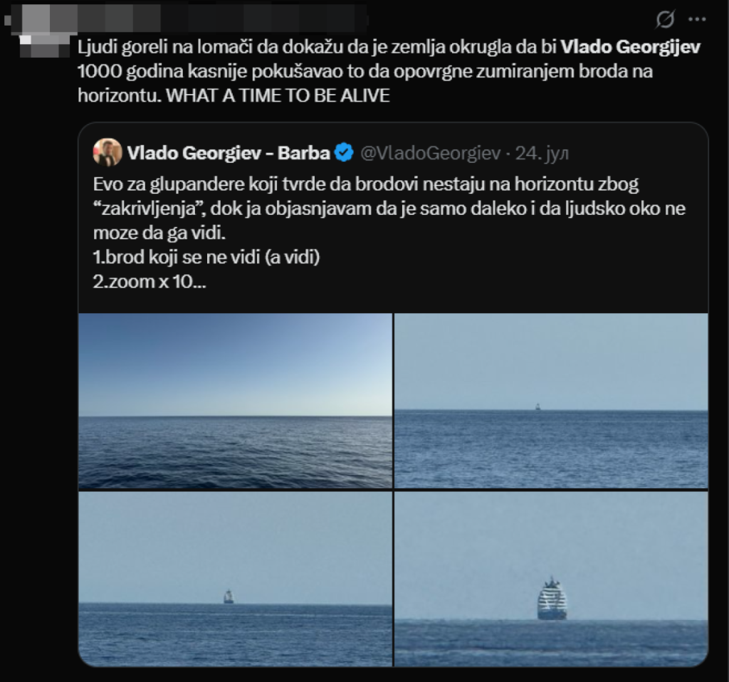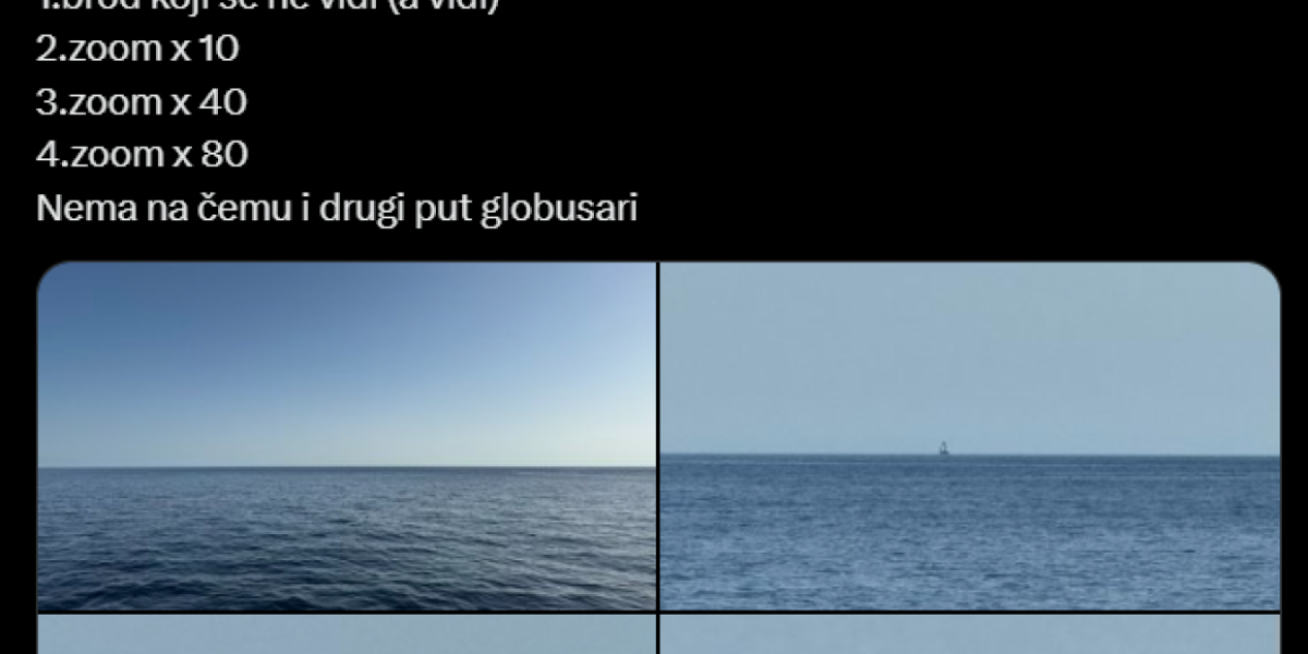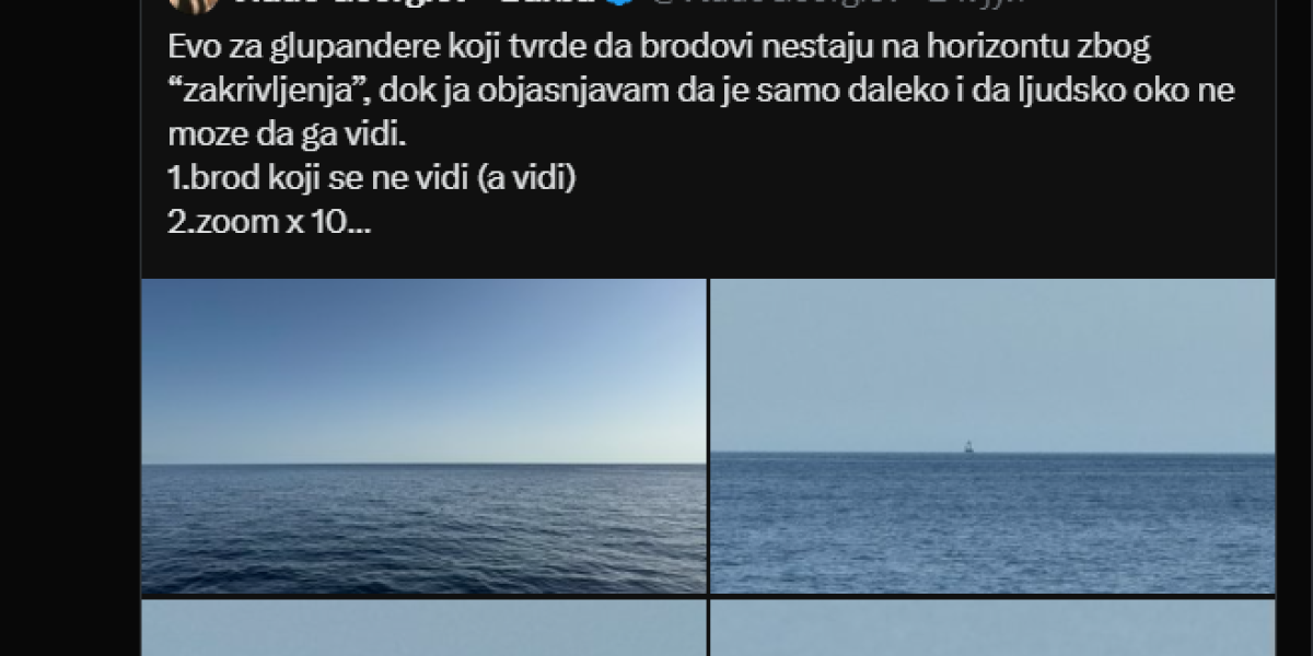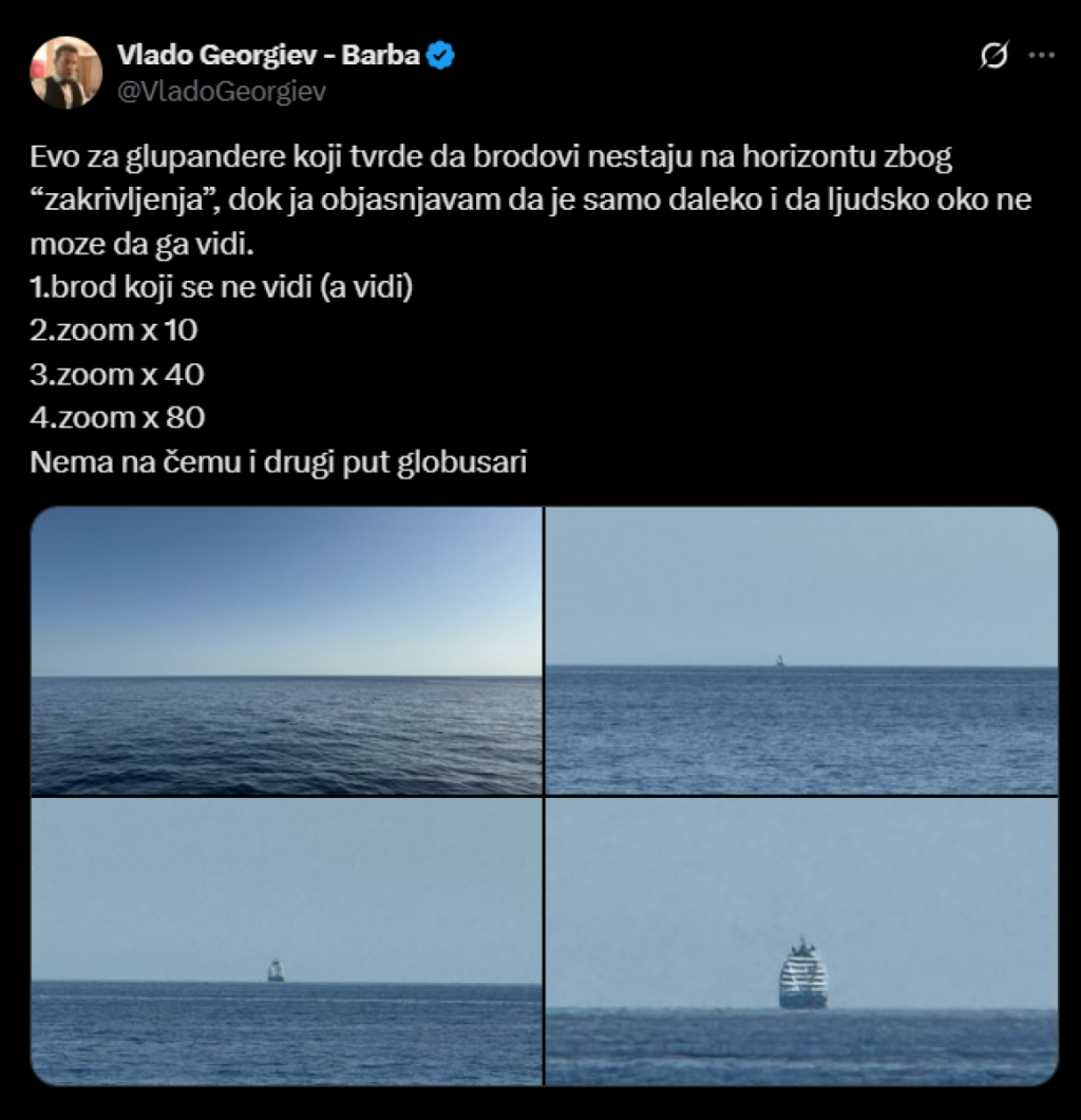 - Evo za glupandere koji tvrde da brodovi nestaju na horizontu zbog “zakrivljenja”, dok ja objašnjavam da je samo daleko i da ljudsko oko ne može da ga vidi. 1.brod koji se ne vidi (a vidi) 2.zoom x 10 3.zoom x 40 4.zoom x 80. Nema na čemu i drugi put globusari - napisao je pevač.