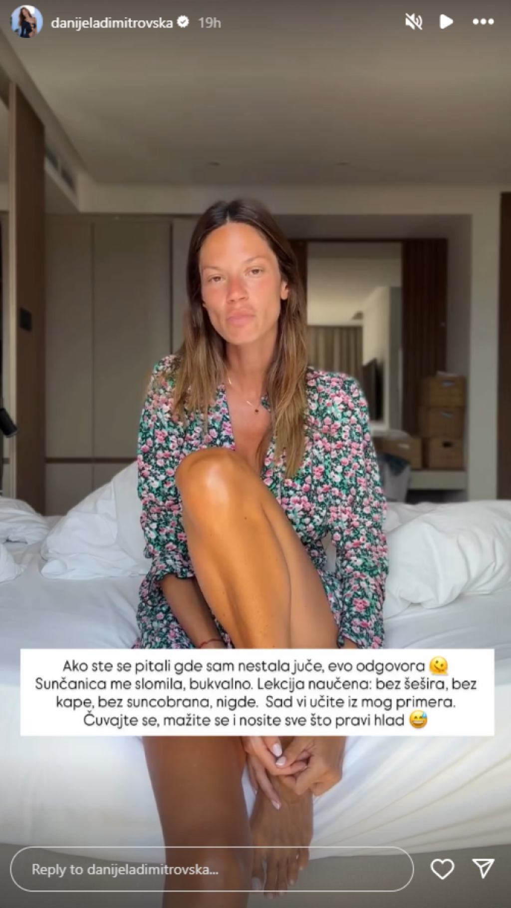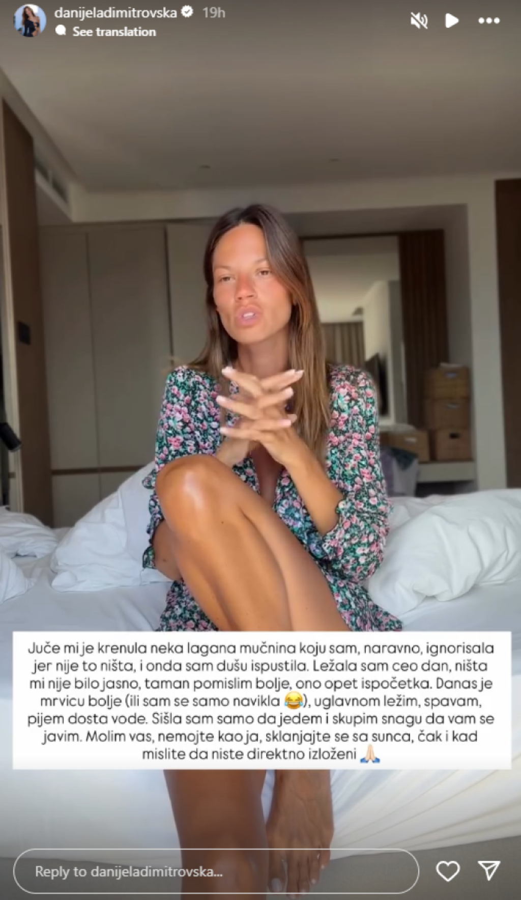 Danijela Dimitrovska oglasila se iz kreveta, iz kog ne ustaje već dva dana. Manekenku je udarila sunčanica, a sada apeluje na ljude, da vode računa kada se izlažu suncu, kako ne bi prolazili isto što i ona.