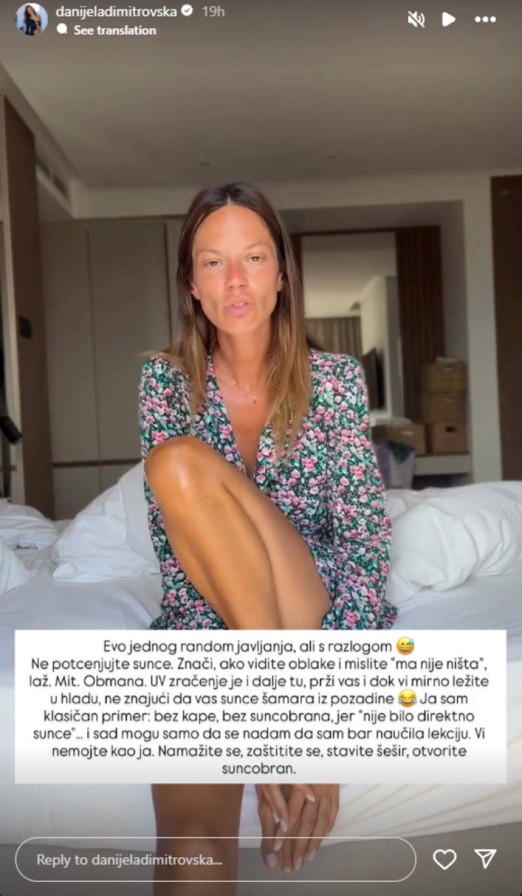 "Evo jednog random javljanja, ali s' razlogom. Ne potcenjujte sunce. Znači, ako vidite oblake i mislite 'ma nije ništa', laž. Mit. Obmana. UV zračenje je i dalje tu, prži vas dok vi mirno ležite u hladu, ne znajući da vas sunce šamara iz pozadine. Ja sam klasičan primer. Sad mogu samo da se nadam da sam naučila lekciju", napisala je Danijela na svom Instagramu, pa dodala: