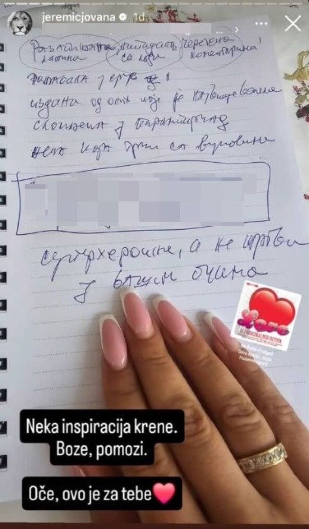 Jovana Jeremić ne krije da joj je velika želja da objavi knjigu u kojoj će objediniti svoje fraze i citate. Iako su je teške životne okolnosti omele u pisanju, inspiracija joj se konačno vratila.