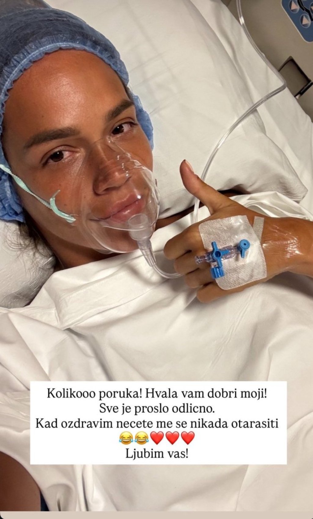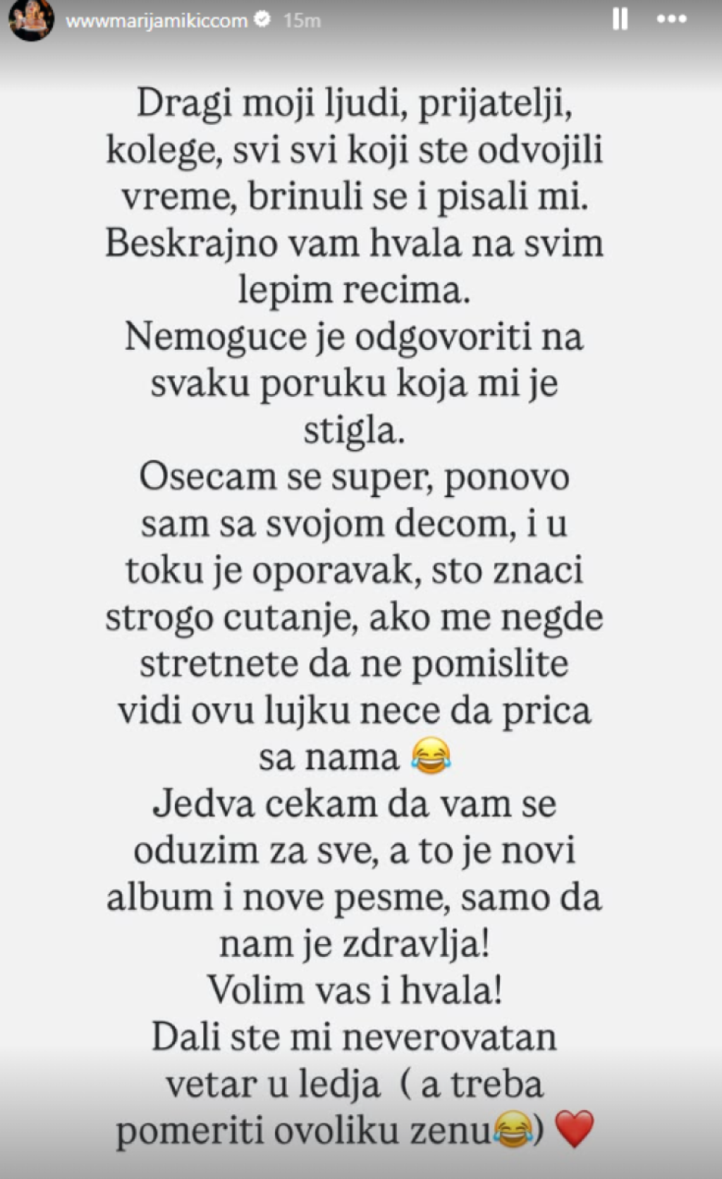 "Dragi moji ljudi, prijatelji, kolege, svi koji ste odvojili vreme, brinuli se i pisali mi. Beskrajno vam hvala na lepim rečima. Nemoguće je odgovoriti na svaku poruku koja mi je stigla. Osećam se super, ponovo sam sa svojom decom, i u toku je oporavak, što znači strogo ćutanje. Ako me negde sretnete da ne pomislite vidi ovu lujku neće da priča sa nama. Jedva čekam da vam se osužim za sve, a to je novi album i nove pesme, samo da nam je zdravlja! Dali ste mi neverovatan vetar u leđa (a treba pomeriti ovoliku ženu)", napisla je Marija na svom Instagram profilu.