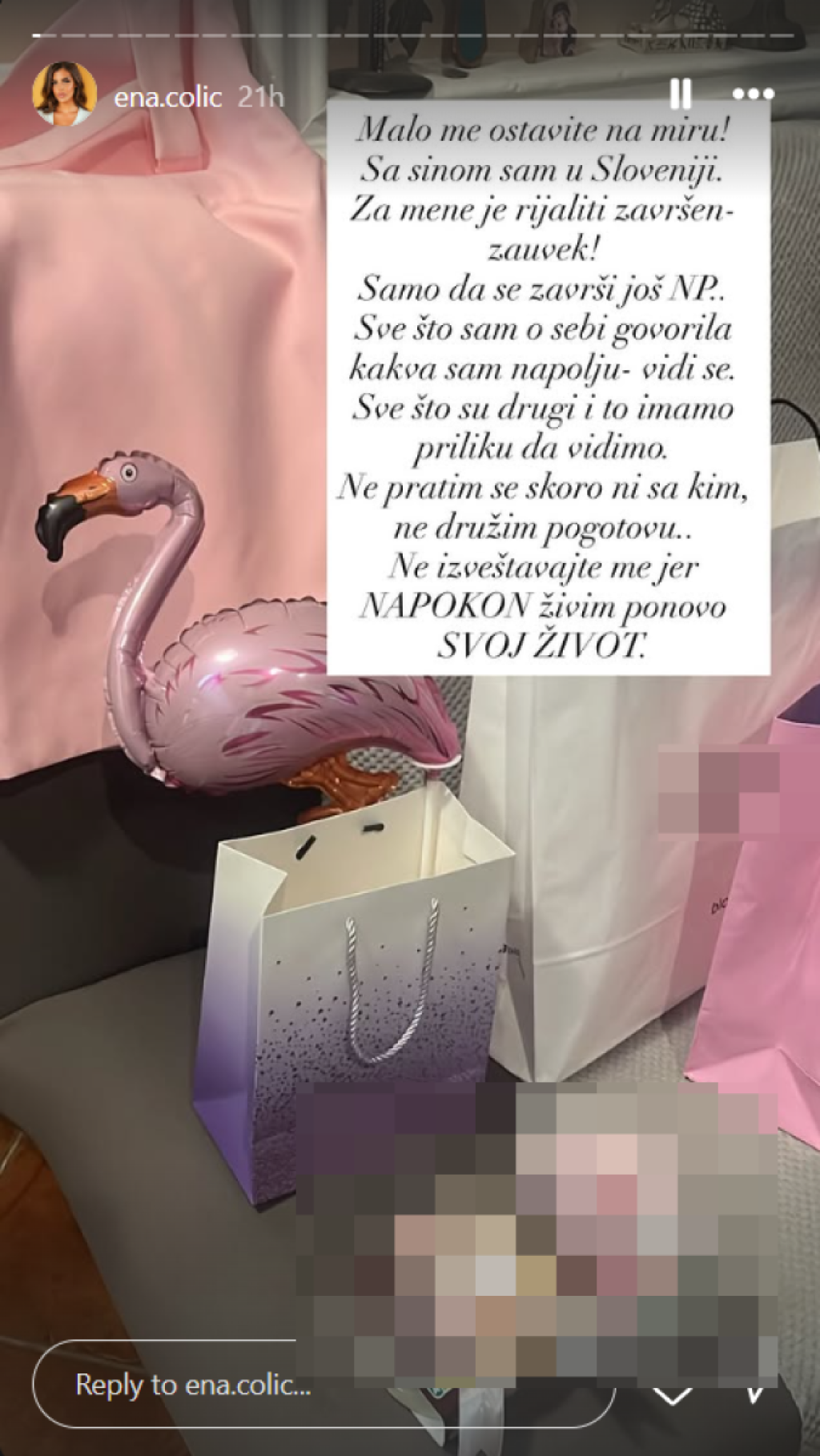 "Malo me ostavite na miru. Sa sinom sam u Sloveniji. Za mene je rijaliti završen, zauvek. Sve što sam o sebi govorila, kakva sam napolju, vidi se. Sve što su drugi - i to imamo priliku da vidimo. Ne pratim se skoro ni sa kim, ne družim se, pogotovo...", napisala je Ena.