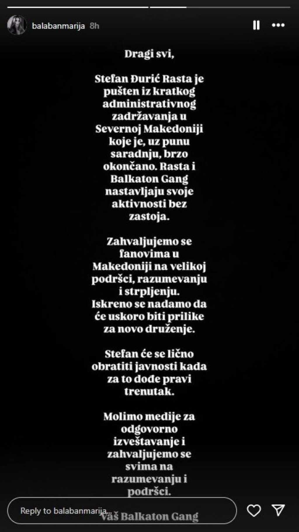 "Stefan Đurić Rasta je pušten iz kratkog administrativnog zadržavanja u Severnoj Makedoniji koje je, uz punu saradnju, brzo okončano. Rasta i Balkaton Gang nastavljaju svoje aktivnosti bez zastoja. Zahvaljujemo se fanovima u Makedoniji na velikoj podršci, razumevanju i strpljenju. Iskreno se nadamo da će uskoro biti prilike za novo druženje. Stefan će se lično obratiti javnosti kada za to dođe pravi trenutak. Molimo medije za odgovorno izveštavanje i zahvaljujemo se svima na razumevanju i podršci. Vaš Balkaton Gang", piše u saopštenju reperovog tima, koje je i Marija podelila.