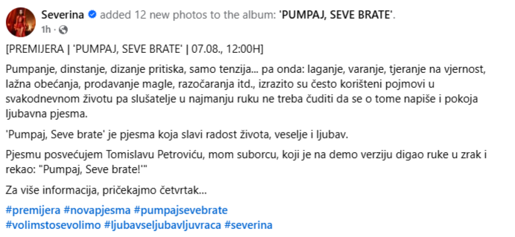 Pesmu posvećujem Tomislavu Petroviću, mom suborcu, koji je na demo verziju digao ruke u zrak i rekao: 'Pumpaj, Seve brate'", napisala je Severina Vučković na društvenoj mreži Fejsbuk.