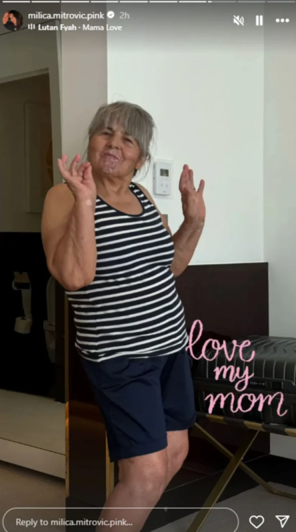 Na fotografiji koju je objavila, Miličina majka, koja je nedavno napunila 85 godina, zrači pozitivnom energijom - nasmejana, u ležernom izdanju, odevena u majicu na pruge i bermude.