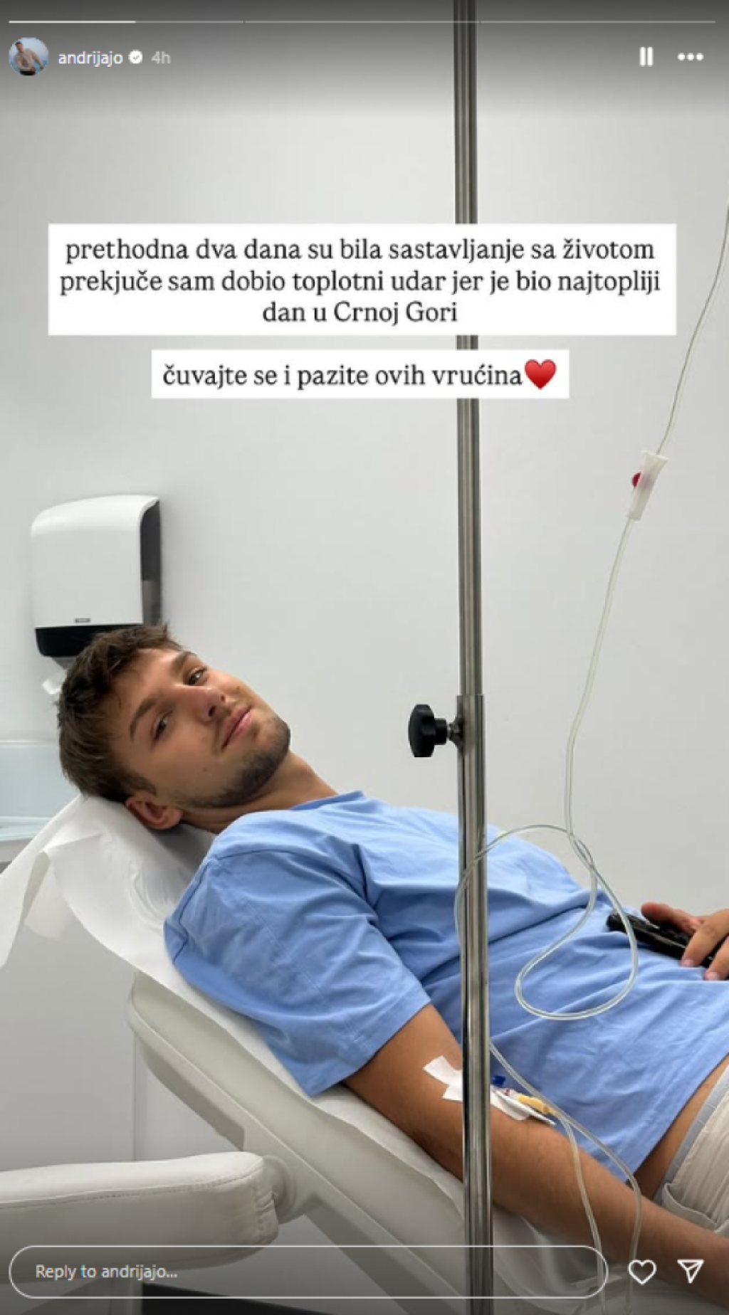 "Prethodna dva dana su bila sastavljanje sa životom, prekjuče sam dobio toplotni udar jer je bio najtopliji dan u Crnoj Gori", napisao je Andrija Jo i dodao: "Čuvajte se i pazite se od ovih vrućina."