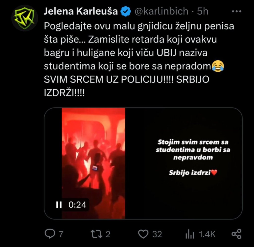 "Pogledajte ovu malu gnjidicu željnu penisa šta piše... Zamislite retarda koji ovakvu bagru i huligane, koji viču "ubij", naziva studentima koji se bore sa nepravdom. Svim srcem uz policiju! Srbijo, izdrži!", napisala je Karleuša na mreži "X".