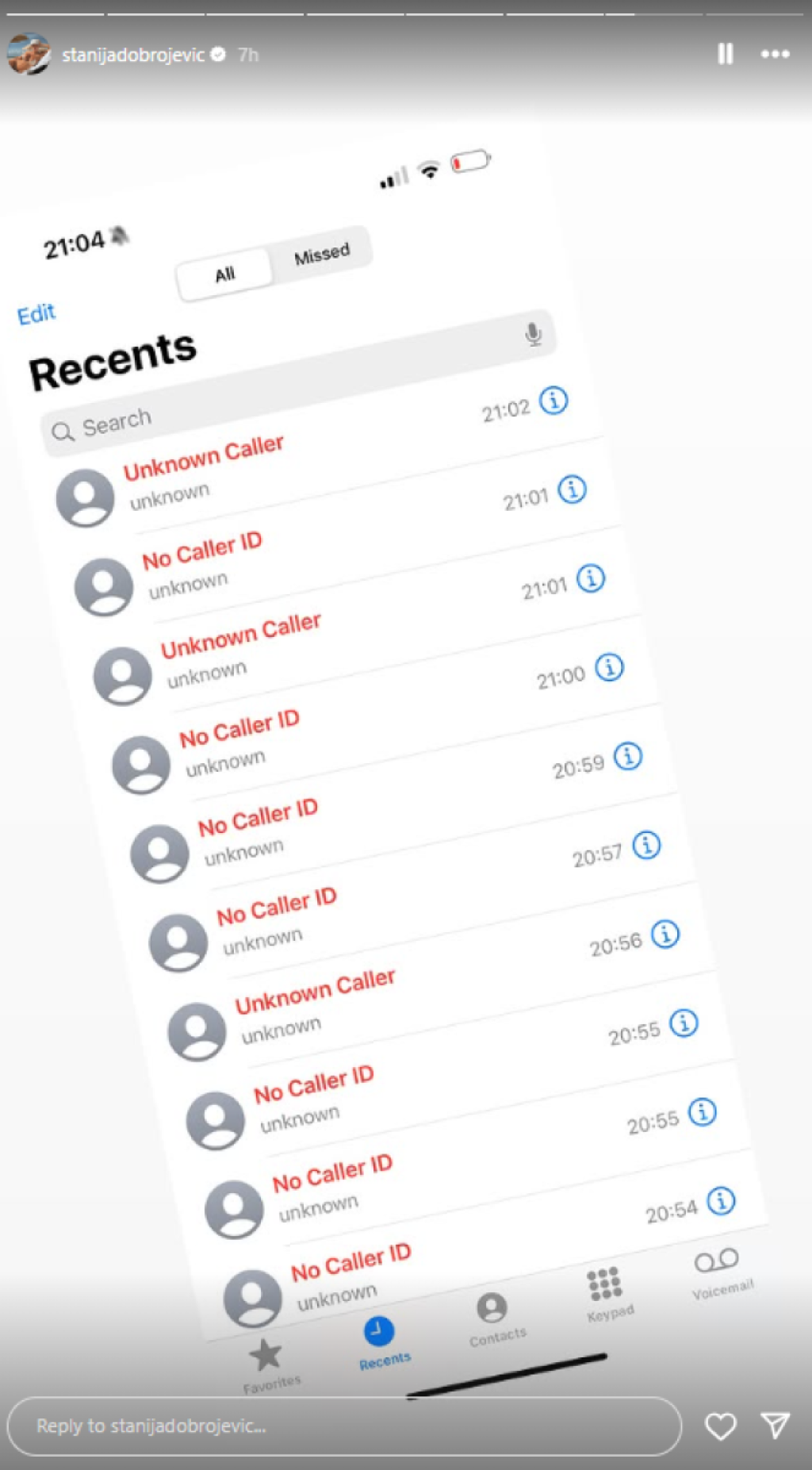 Kako se vidi na fotografiji koju je obajvila na Instagramu, Stanija nije odgovorila ni na jedan poziv.