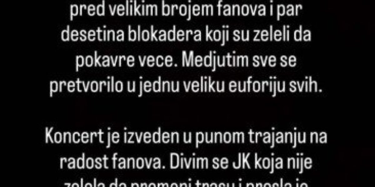 - Večerašnji koncert Jelene Karleuše u Loznici protekao je uz puno emocija pred velikim brojem fanova i par desetina blokadera koji su želeli da pokvare veče. Međutim, sve se pretvorilo u jednu veliku euforiju svih. Koncert je izveden u punom trajanju na radost fanova. Divim se Jeleni Karleuši koja nije želela da promeni trasu i prošla je hrabro kroz sve blokadere na putu od bine do automobila kada se koncert završio.