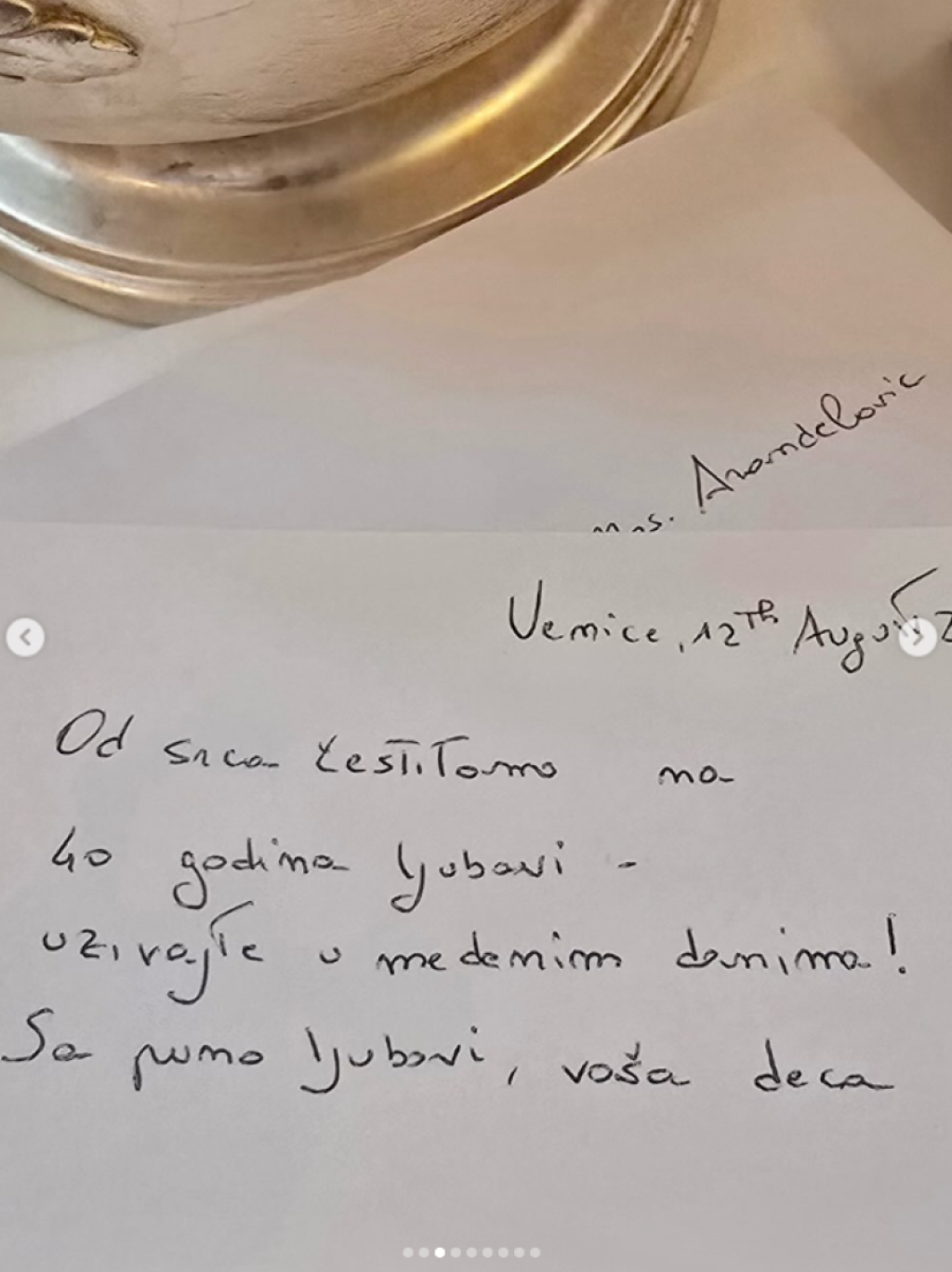 "Od srca čestitamo na 40 godina ljubavi. Uživajte u medenim danima! Sa puno ljubavi, vaša deca."