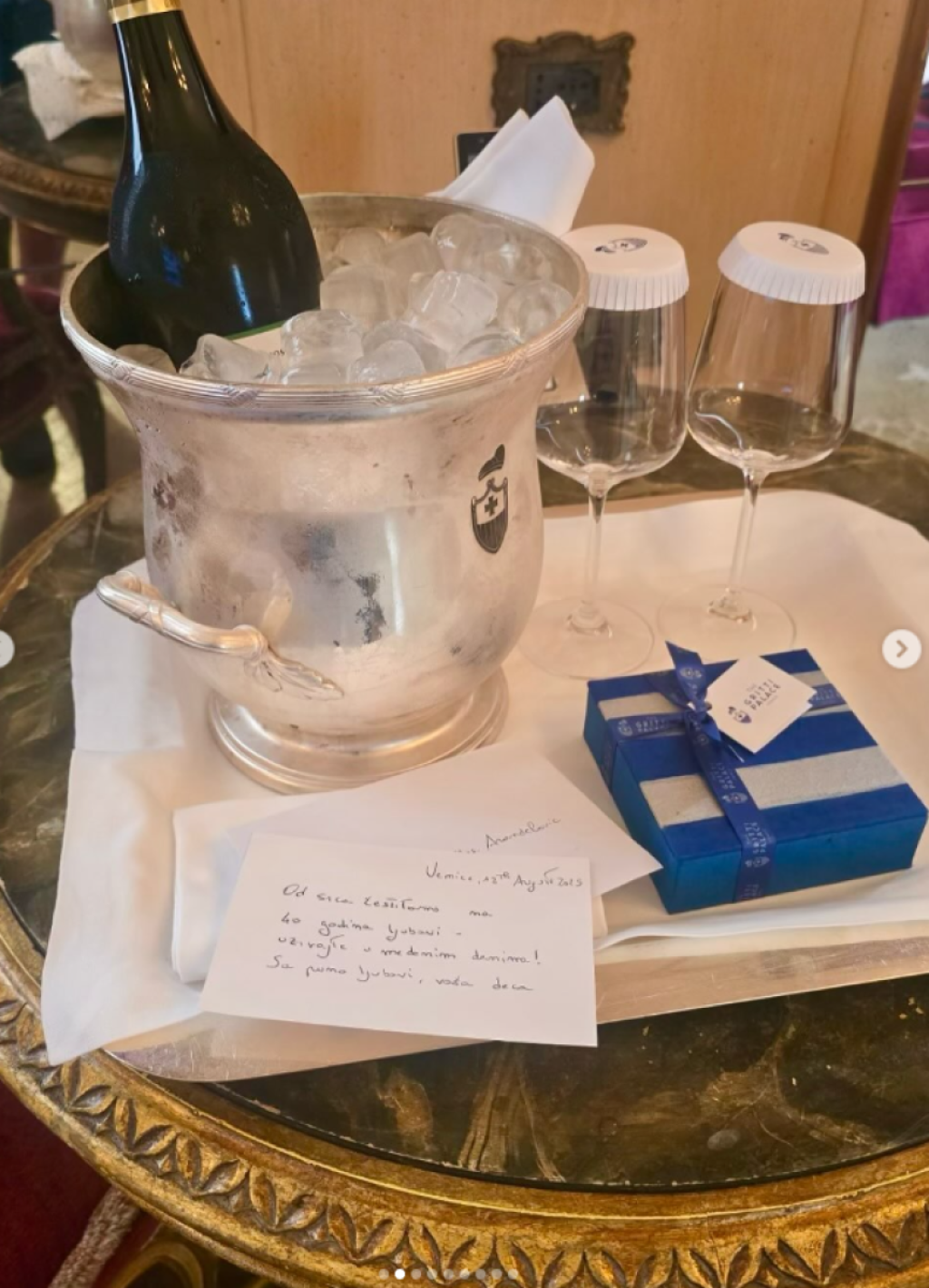 Već na samom ulasku u apartman sa pogledom na čuveni Veliki kanal, dočekali su ih šampanjac, jagode u čokoladi i dirljiva poruka:
