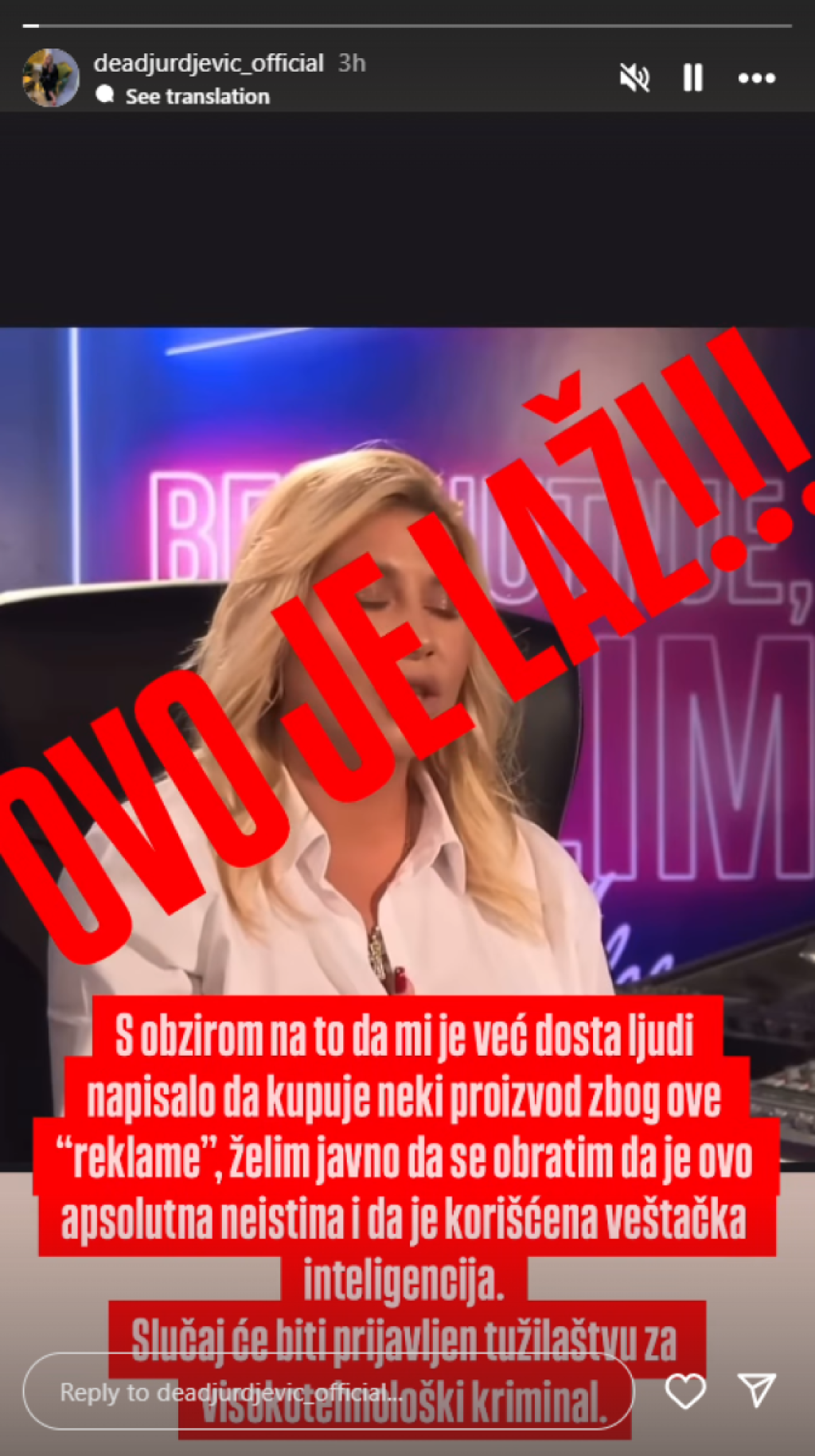 "Ovo je laž! S obzirom na to da mi je već dosta ljudi napisalo da kupuje neki proizvod zbog ove 'reklame', želim javno da se obratim da je ovo apsolutna neistina i da je korišćena veštačka inteligencija. Slučaj će biti prijavljen tužilaštvu za visokotehnološki kriminal", napisala je Đurđevićeva.