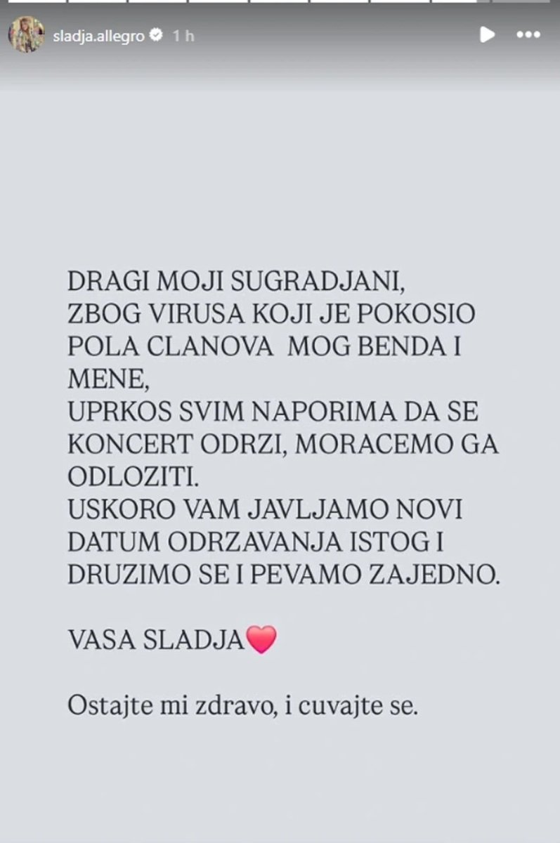 "Dragi moji sugrađani, zbog virusa koji je pokosio pola članova mog benda i mene, uprkos svim naporima da se koncert održi, moraćemo ga odložiti. Uskoro javljamo novi datum održavanja istog. Družimo se i pevamo zajedno. Ostajte mi zdravo i čuvajte se, vaša Slađa", poručila je folkerka.