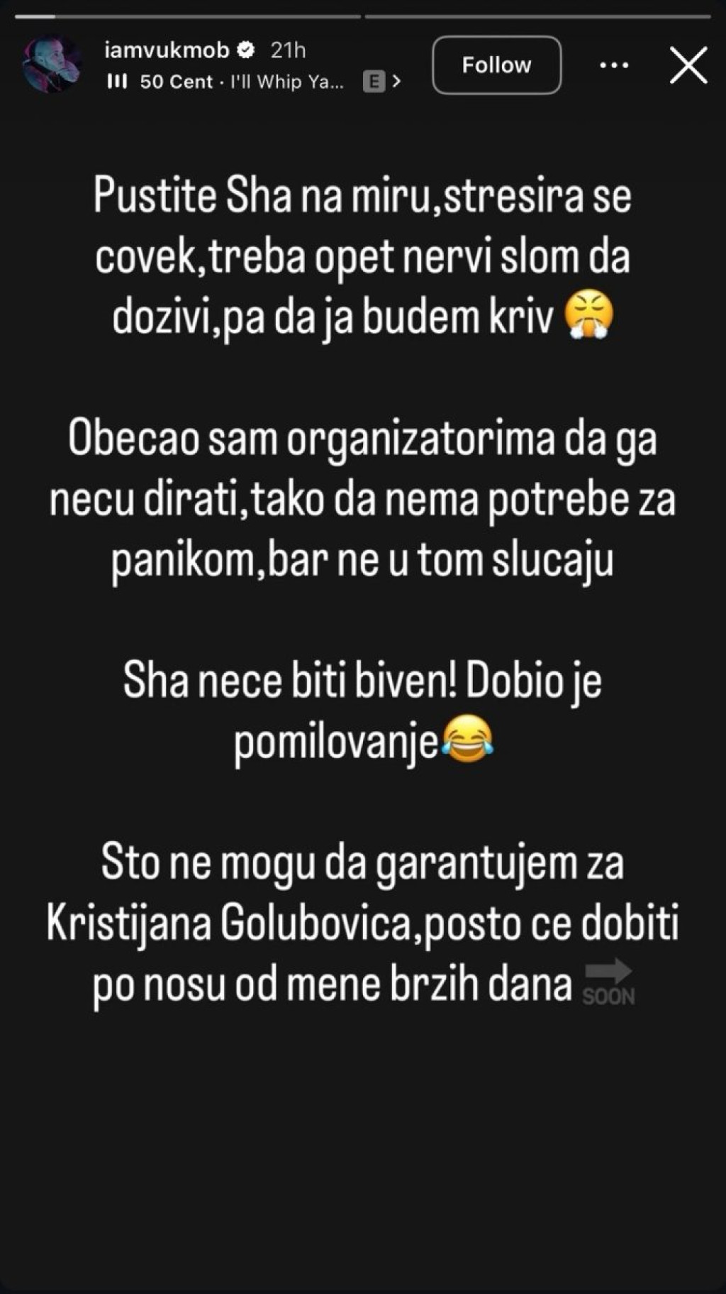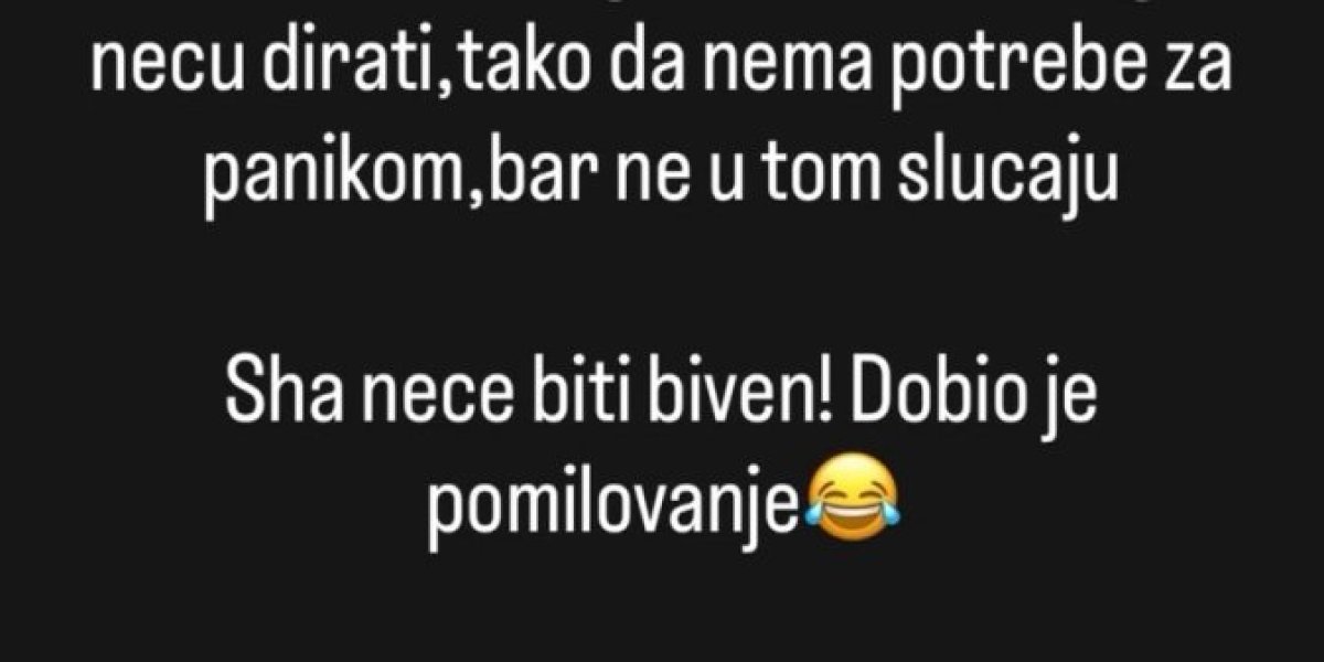 "Pustite Ša na miru, stresira se čovek, pa još samo fali da opet doživi nervni slom, a ja da ispadnem kriv. Obećao sam organizatorima da ga neću dirati, tako da nema potrebe za panikom - bar ne u tom slučaju. Ša neće biti biven! Dobio je pomilovanje", napisao je on, pa se obratio pobedniku "Farme 8":