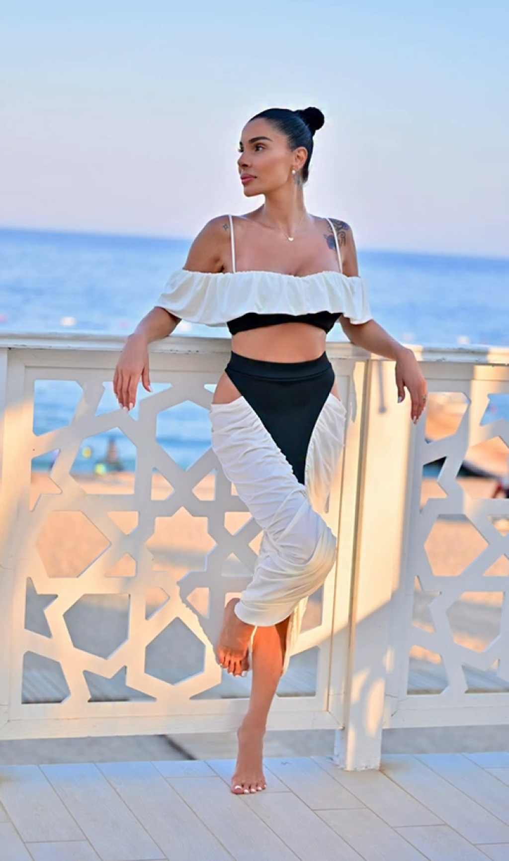 Na društvenim mrežama Mia je podelila fotografije na kojima nosi dvodelni set - tanga suknju (suknju na kojoj se pomoću različitih boja materijala stvara optička varka) i crno-beli top.
