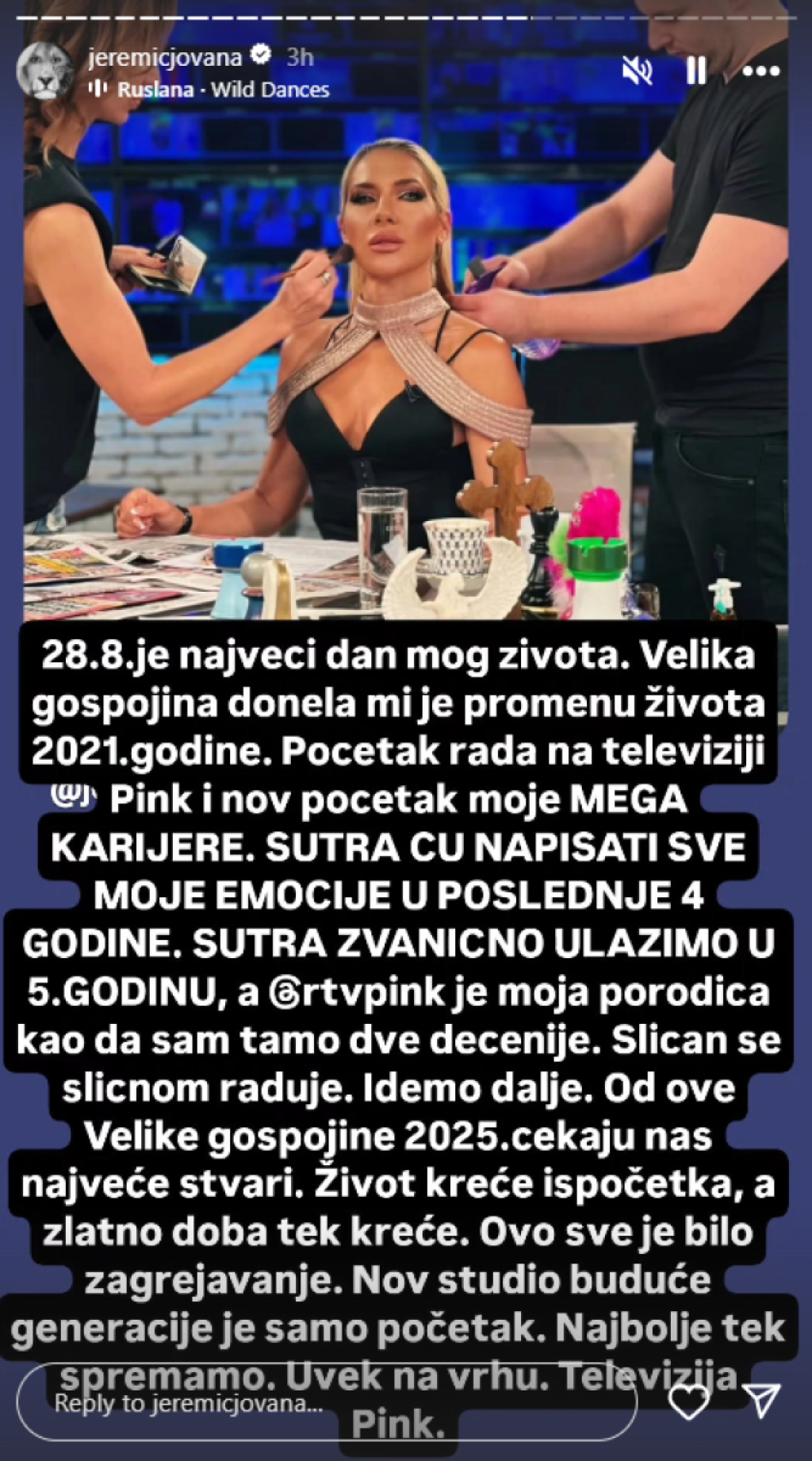 "28.8. je najveći dan mog života. Velika Gospojina donela mi je promenu života 2021. godine. Početak rada na televiziji Pink i nov početak moje megakarijere. Sutra ću napisati sve moje emocije u poslednje 4 godine. Sutra zvanično ulazimo u petu godinu. TV Pink je mja porodica. Kao da sam tamo dve decenije. Sličan se sličnom raduje. Idemo dalje. Od ove Velike Gospojine 2025. čekaju nas velike stvari. Život kreće ispočetka, a zlatne stvari tek čekaju. Ovo je bilo zagrevanje. Novi studio buduće generacije je samo početak. Najbolje tek spremamo. Uvek na vrhu. TV Pink", napisala je ona u opisu objave sa slikom na kojoj je šminkeri sređuju pred početak emisije.