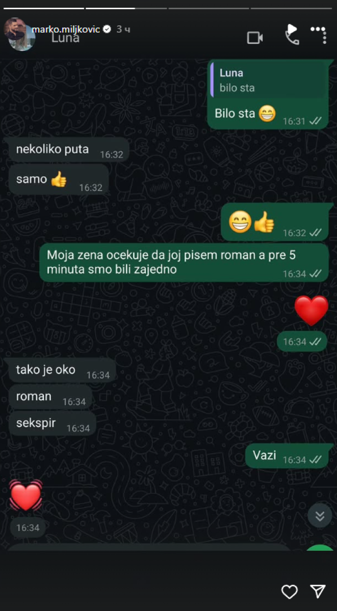 Bivši rijaliti učesnik Marko Miljković objavio je na svom Instagramu prepisku sa suprugom Lunom Đogani koja se naljutila zbog načina na koji joj on odgovara na poruke.