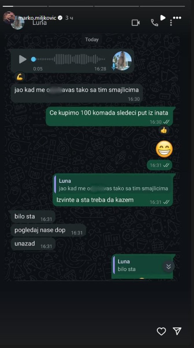Naime, Đoganijevoj se nije svidelo što joj Marko odgovara na poruke sa smajlićima samo što mu je i prebacila. Miljkoviću je to bilo smešno i morao da podeli sa svojim brojnim pratiocima na mrežama.