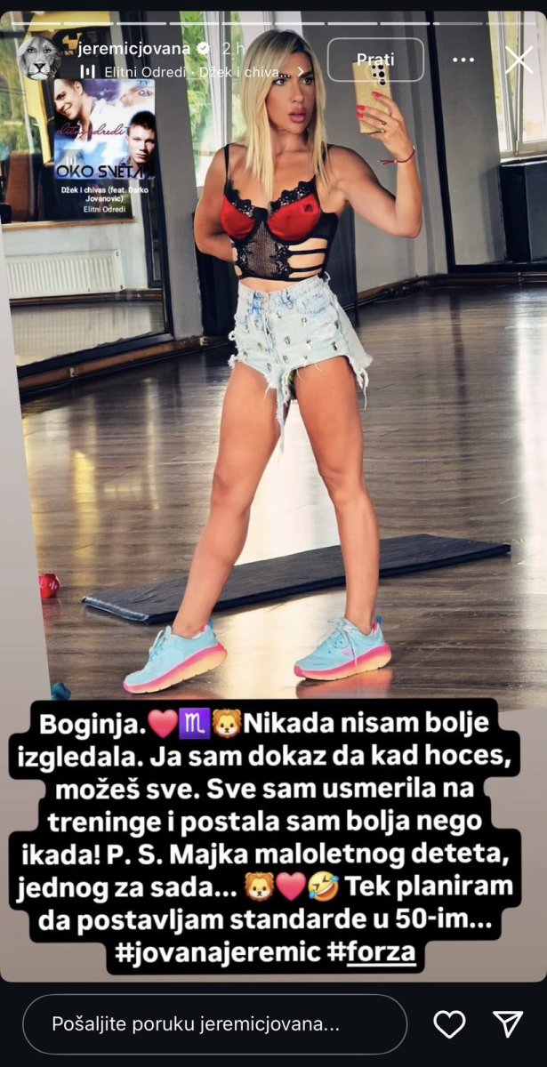"Boginja. Nikada nisam bolje izgledala. Ja sam dokaz da kada hoćeš, možeš sve. Sve sam usmerila na treninge i postala sam bolja nego ikada. P. S. majka maloletnog deteta, jednog za sada... Tek planiram da postavljam standarde u 50-im", napisala je Jeremićeva u opisu fotke.