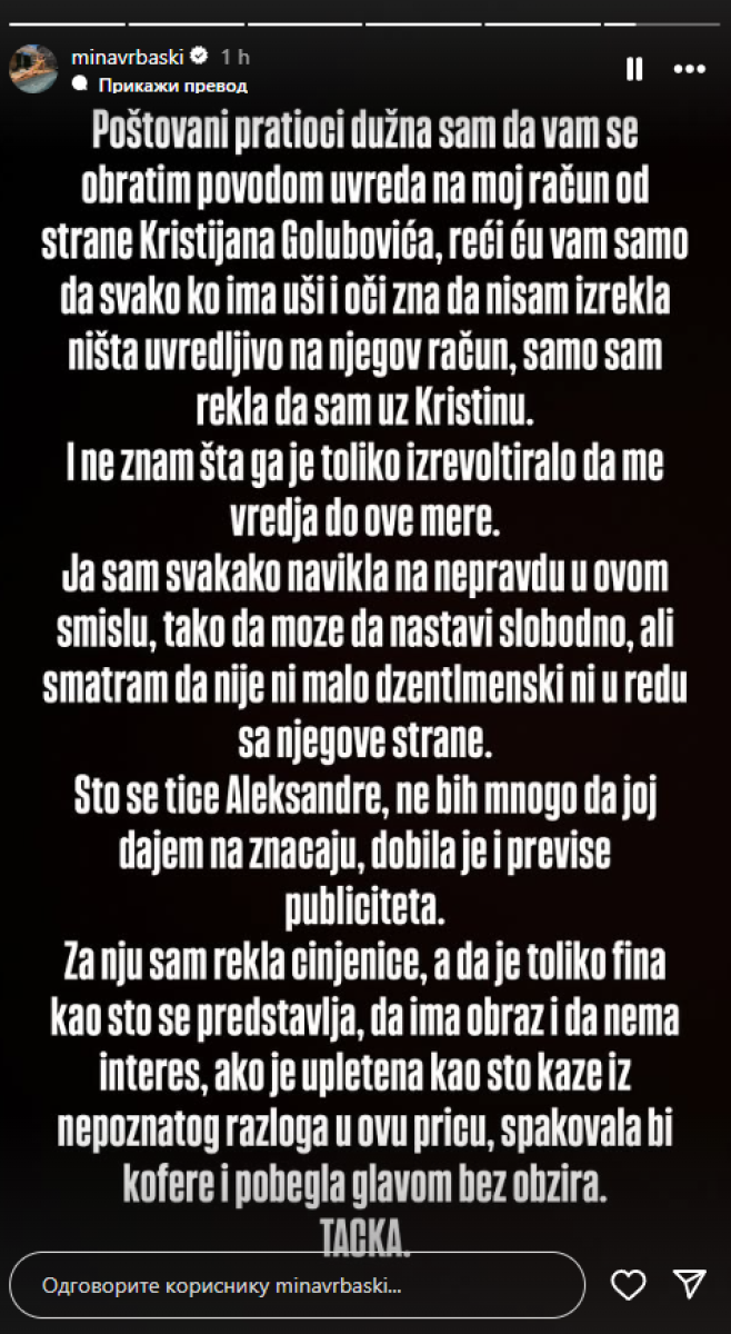 "Poštovani pratioci, dužna sam da vam se obratim povodom uvreda na moj račun od strane Kristijana Golubovića. Reći ću vam samo da svako ko ima uši i oči zna da nisam izrekla ništa uvredljivo na njegov račun, samo sam rekla da sam uz Kristinu. Ne znam šta ga je toliko izrevoltiralo da me vredja do ove mere", napisala je Mina, pa dodala: