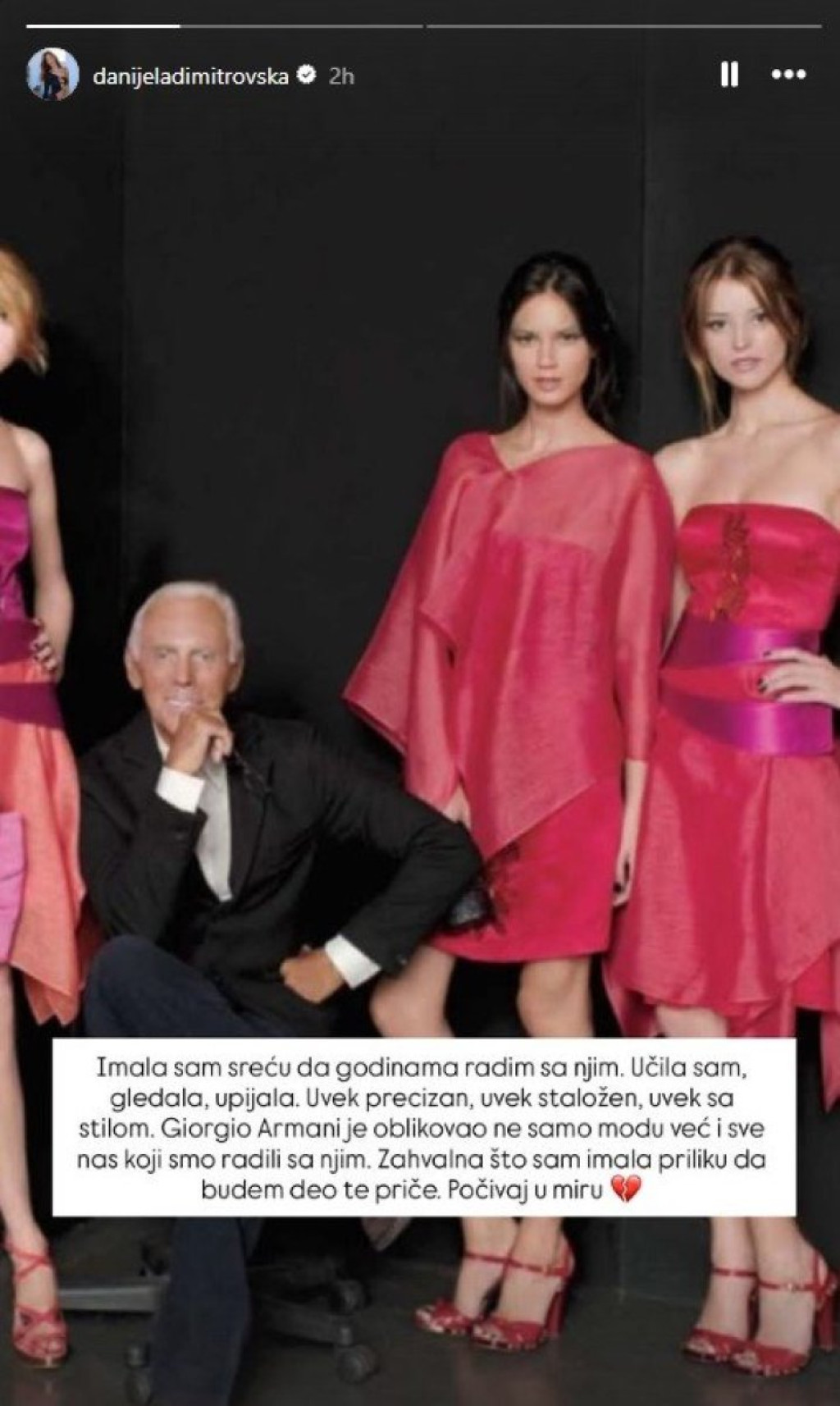 - Imala sam sreću da godinama radim sa njim. Učila sam, gledala, Upijala. Uvek prezican, staložen, uvek sa stilom. Đorđo Armani je oblikovao ne samo modu već i sve nas koji smo radili sa njim. Zahvalna sam što sam imala priliku da budem deo te priče. Počivaj u miru - napisala je Danijela Dimitrovska i dodala emotikone slomljenog srca.