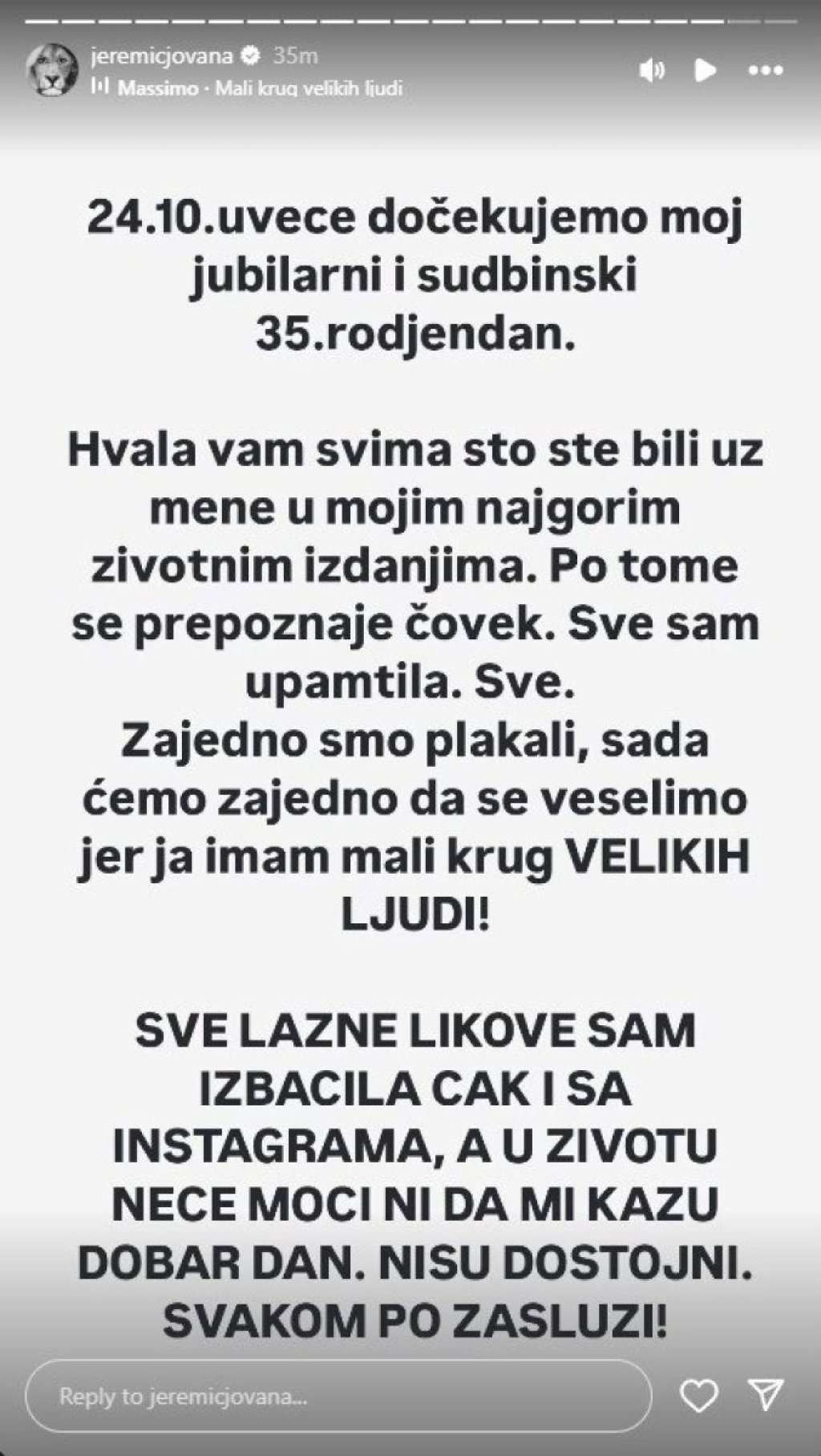 Zajedno smo plakali, sada ćemo zajedno da se veselimo jer ja imam mali krug velikih ljudi! Sve lažne likove sam izbacila čak i sa Instagrama, a u životu neće moći ni da mi kažu dobar dan. Nisu dostojni. Svakom po zasluzi!", napisala je Jeremićeva.