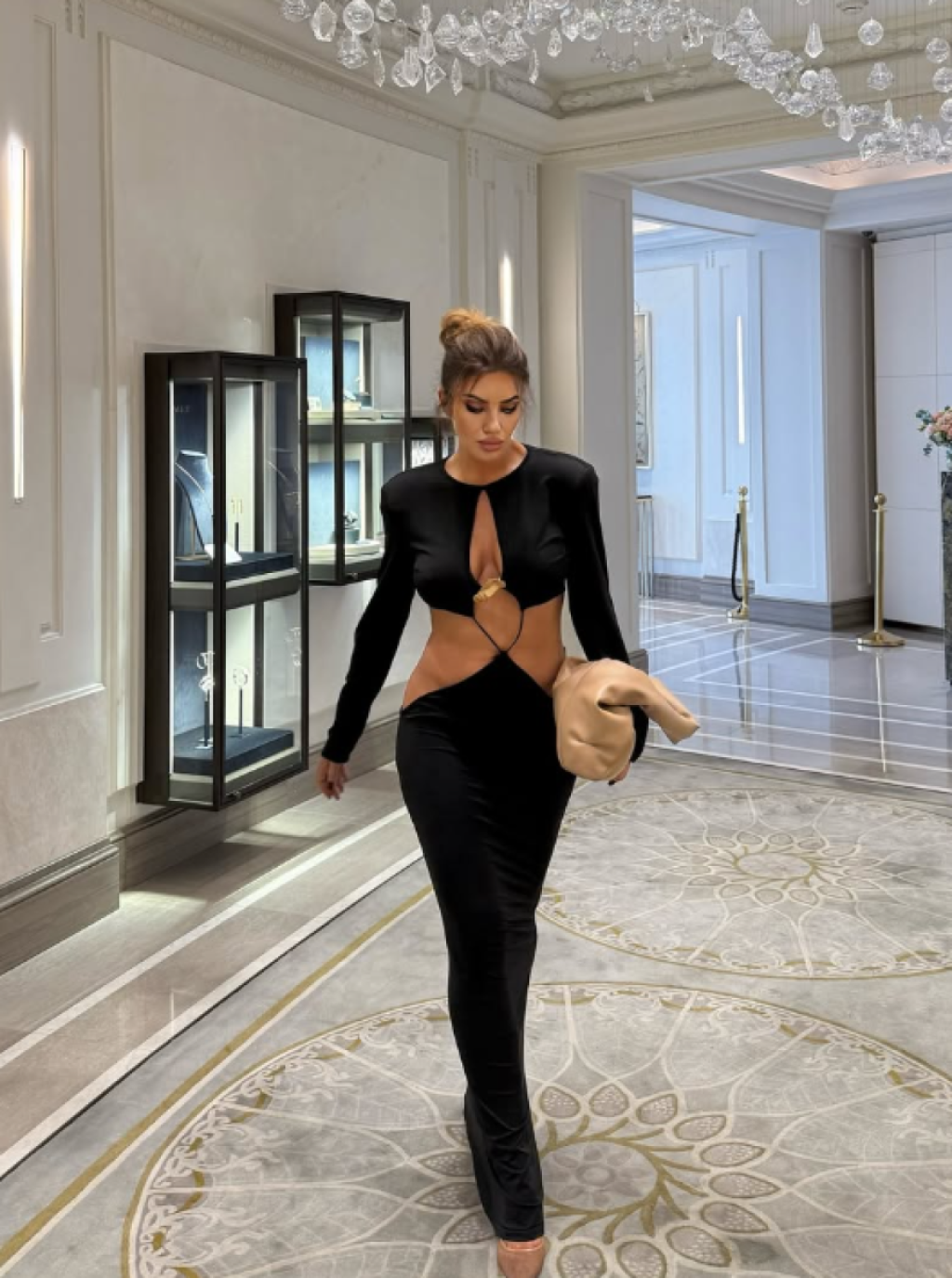 Sindi je na sebi ponela crnu, dugu haljinu sa dugim rukavima, koja je imala otvor u predelu grudi, pa tako nije moglo proći neopaženo njeno poprsje.
