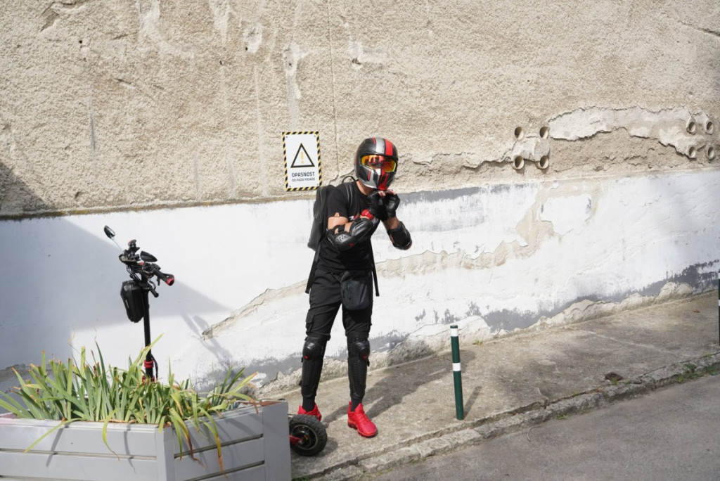 Svoj stajling je uklopio sa bojom trotineta, pa se od glave do pete obukao u crno-crvenu boju, jer Milan uvek misli o svakom detalju.