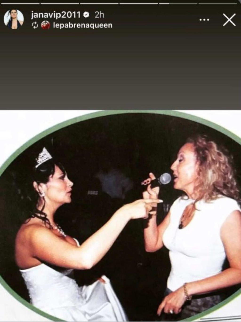 Atmosferu do usijanja dovela je Janina koleginica Lepa Brena koja je mladencima zapevala neke od svojih najvećih hitova. Todorovićeva na Instagramu evocirala uspomene, a fotografija sa koleginicom i dugogodišnjom prijateljicom oduševila je brojne pratioce.