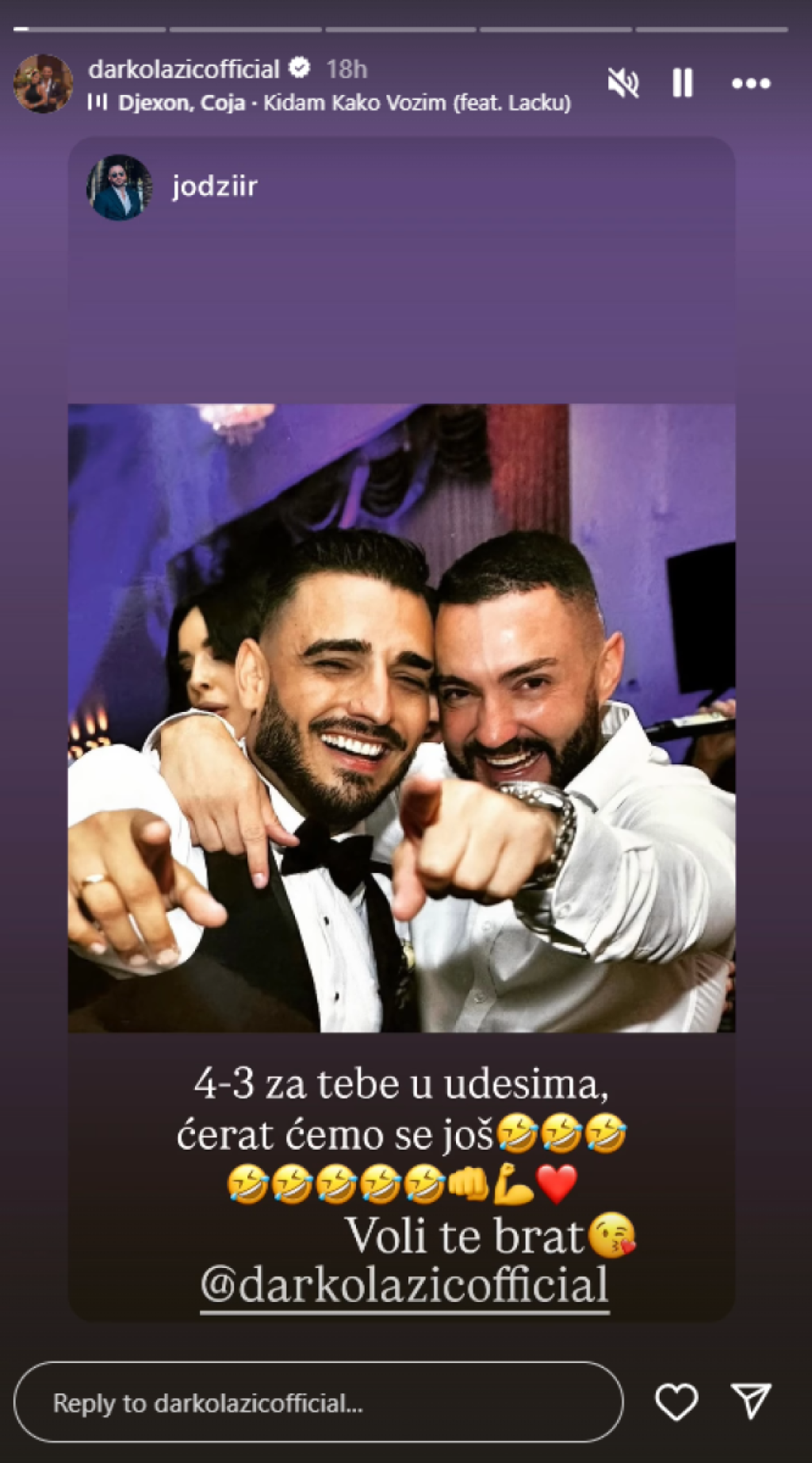 "4:3 za tebe u udesima, ali ćeraćemo se još. Voli te brat", napisao je Radulović uz emotikone koji plaču od smeha i pesmu "Kidam kako vozim".