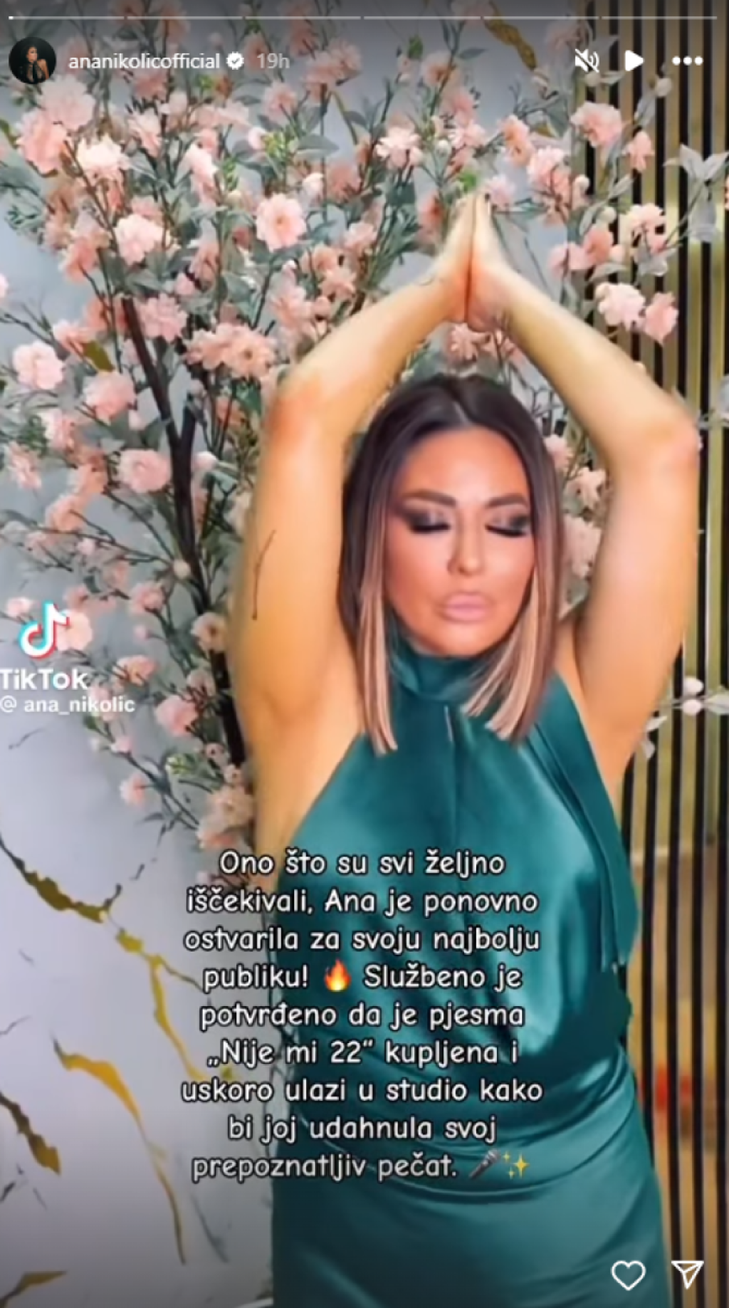 - Ono što su svi željno iščekivali, Ana je ponovo ostvarila za svoju najbolju publiku. Službeno je potvrđeno da je pesma ''Nije mi 22'' kupljena i uskoro ulazi u studio kako bi joj udahnula svoj prepoznatljiv pečat - potvrđeno je na pevačicinom Instagram profilu.