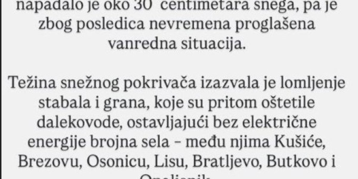 "Sneg koji je tokom noći zavejao ivanjički kraj doneo je ozbiljne probleme stanovnicima ove optine. U višim planinskim predelima napadalo je oko 30 cm snega, pa je zbog poslednica nevremena proglašena vanredna situacija".