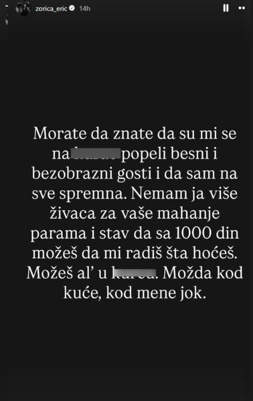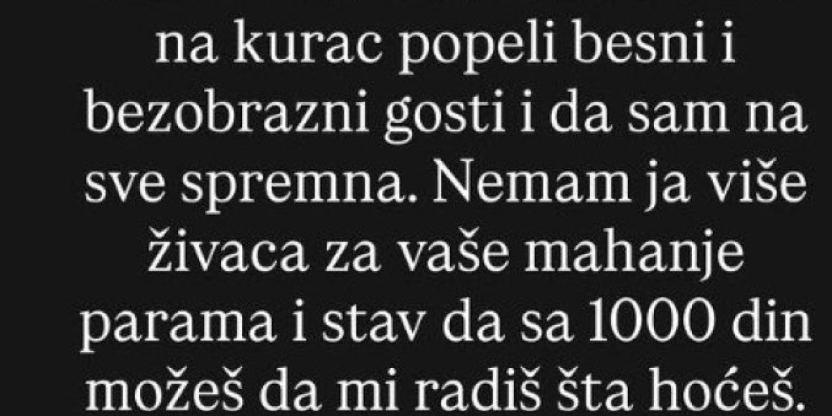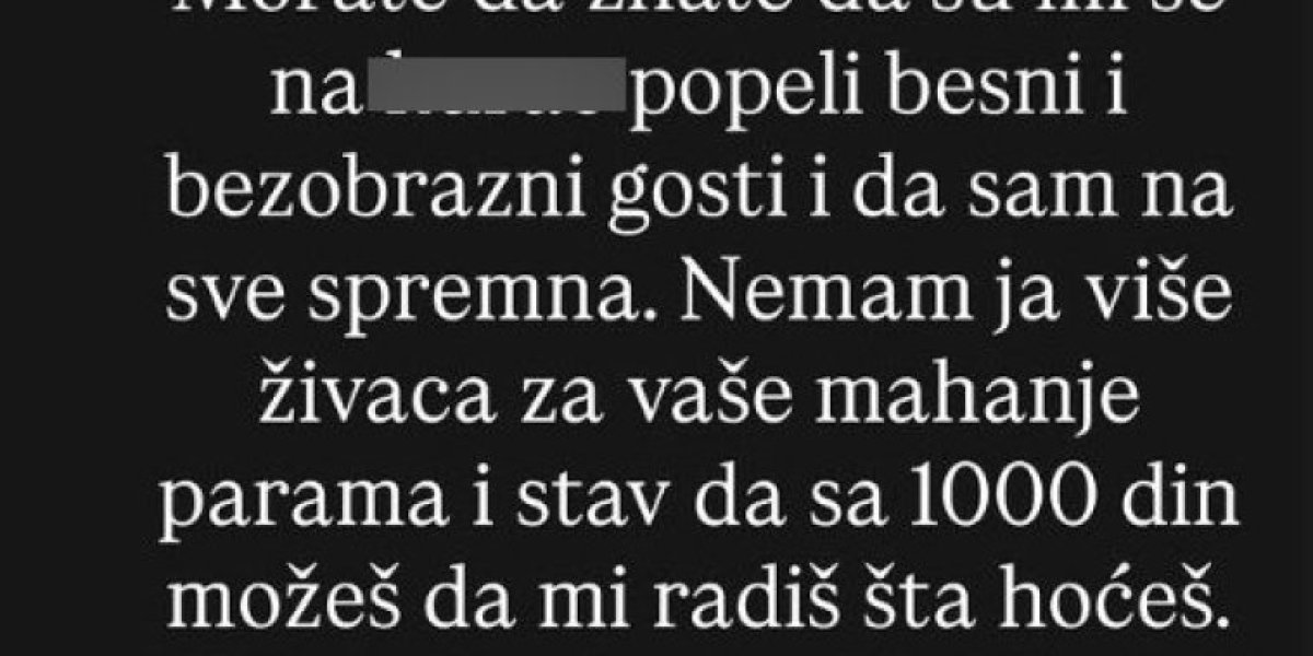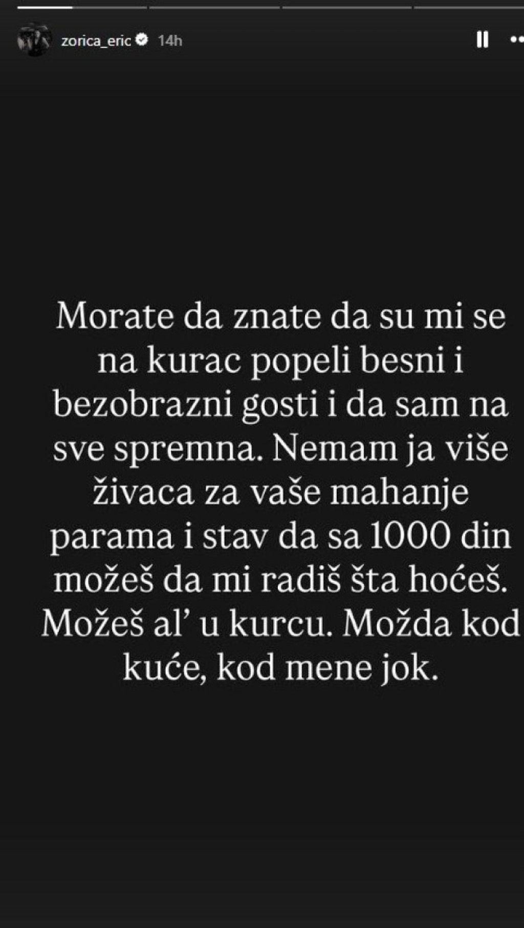 "Morate da znate da su mi se na ku*cu popeli besni i bezobrazni gosti i da sam na sve spremna. Nemam ja više živaca za vaše mahanje parama i stav da sa 1.000 dinara možeš da mi radiš šta hoćeš. Možeš, al’ u ku*ac. Možeš kod kuće, kod mene jok", napisala je Erić dok je još bila na nastupu.