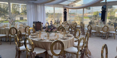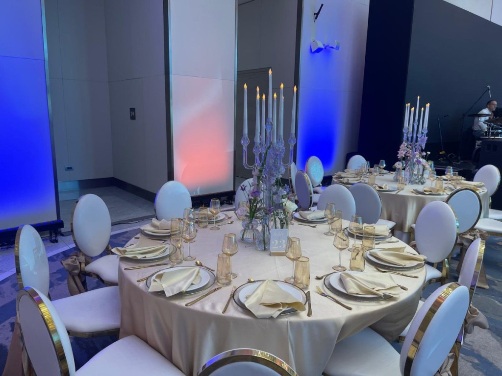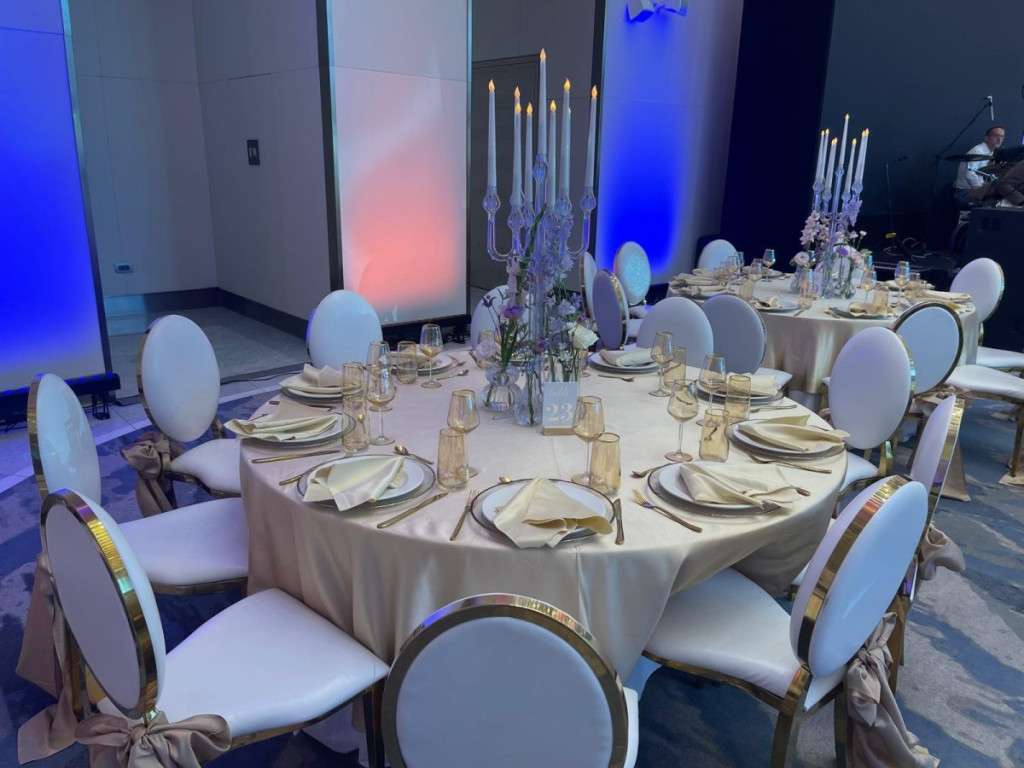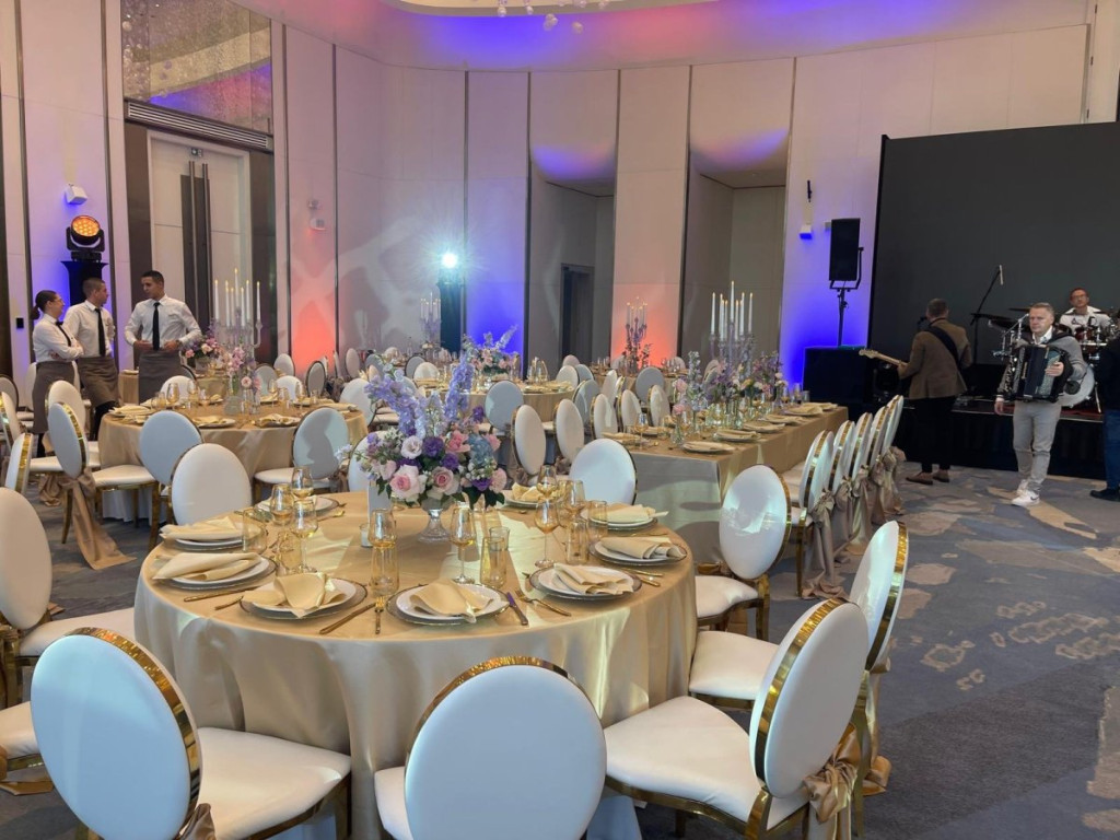 Dekoracija je bila urađena u zlatnim nijansama, dok su stolove krasili raskošni cvetni aranžmani u nežnim roze tonovima, koji su dodatno naglašavali eleganciju prostora.