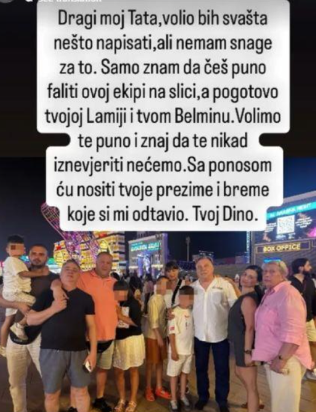 "Dragi moj tata, voleo bih svašta nešto napisati, ali nemam snage za to. Samo znam da ćeš puno faliti ovoj ekipi na slici, a pogotovu tvojoj Lamiji i tvom Belminu. Volimo te puno i znaj da te nikada nećemo izneveriti. S ponosom ću nositi tvoje prezime i breme koje si mi ostavio. Tvoj Dino", napisao je Dino na Instagramu uz zajedničku porodičnu fotografiju.