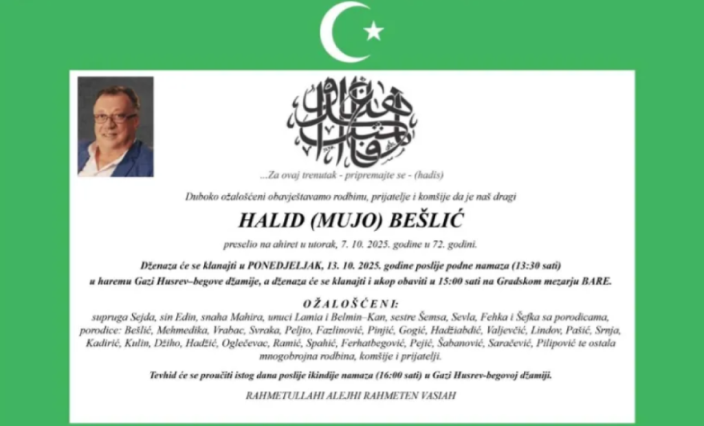 Halid Bešlić će biti sahranjen u ponedeljak 13. oktobra na gradskom groblju Bare u Sarajevu.