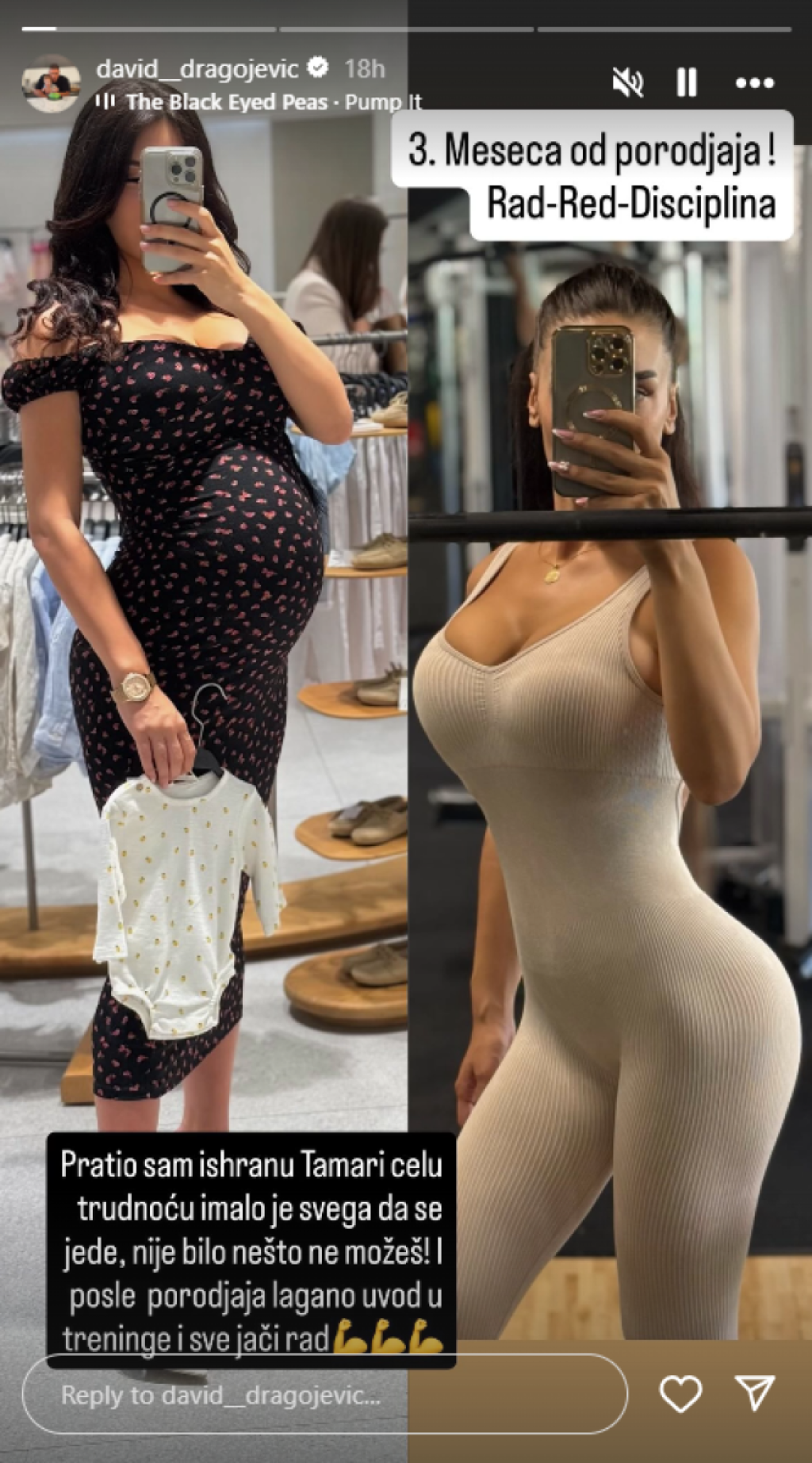 David je na društvenim mrežama podelio fotografiju iz perioda trudnoće i uporedio je sa njenim izgledom tri meseca kasnije, ističući koliko se brzo vratila u formu.