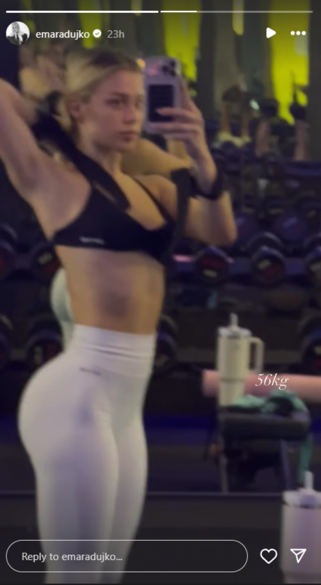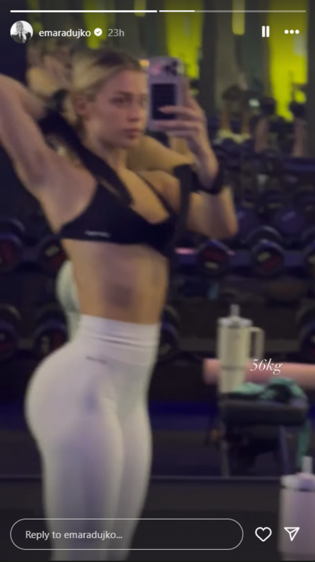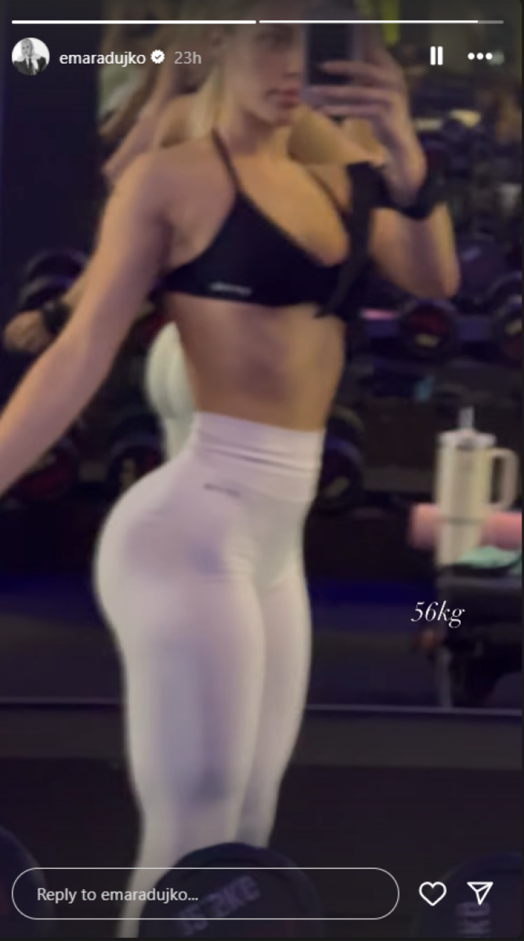 Na fotografijama, Ema, koju su povezivali sa bivšim fudbalerom Dragišom Gudeljom, nosila je helanke i top koji su istakli njen zategnut stomak i bujnu zadnjicu.