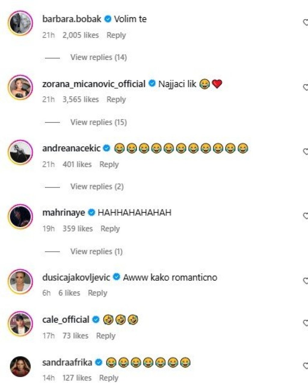 Među prvima je komentar ostavila pevačica Milica Todorović, a zatim Andreana Čekić, Sandra Afrika i Mahrina koje su ostavile emodžije koji plaču od smeha, dok je Indi napisala "Moj brat blizanac, ali bukvalno".