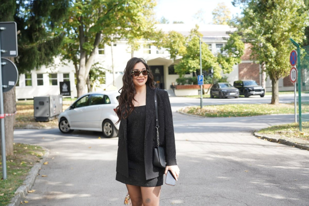 Sanja je za ovu priliku odabrala elegantnu kombinaciju u crnoj boji: usku haljinu i sako, koje je upotpunila crnim naočarima za sunce i torbicom u istom tonu.