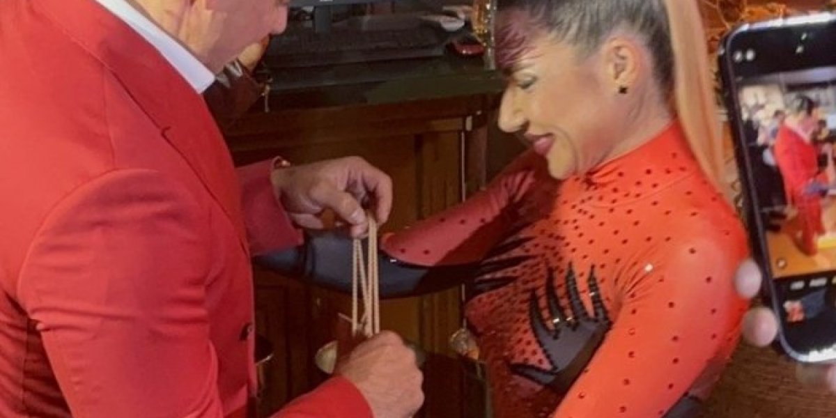 Voditeljka Jovana Jeremić je na podijumu zaigrala sa biznismenom Draganom Stanković koji ju je pratio u korak.