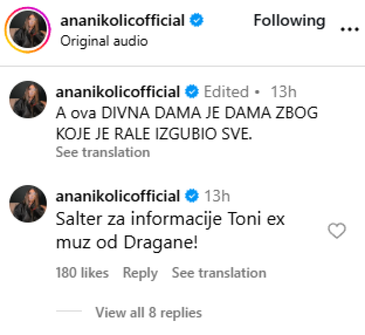 „Šalter za informacije - Toni, bivši muž od Dragane!“, dodala je u komentarima.