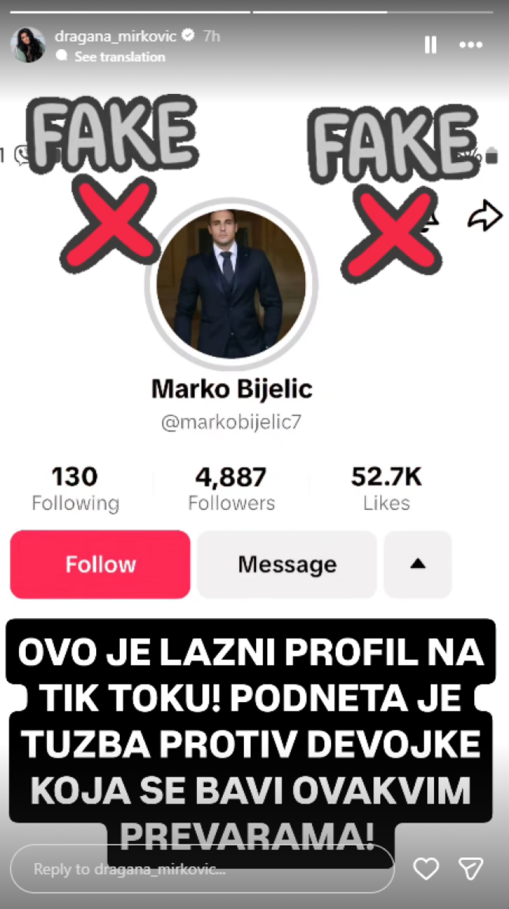 "Ovo je lažni profil na TikToku! Podneta je tužba protiv devojke koja se bavi ovakvim prevarama", napisala je pevačica na Instagramu.