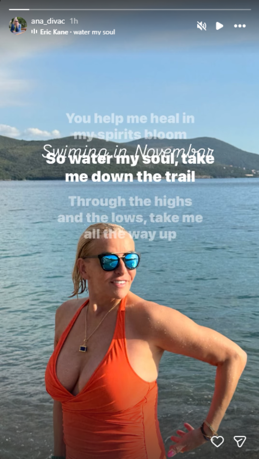 Anine grudi bile su u prvom planu, a na licu je imala naočare za sunce. Divčeva supruga uz fotografiju je kratko poručila: "Plivanje u novembru".