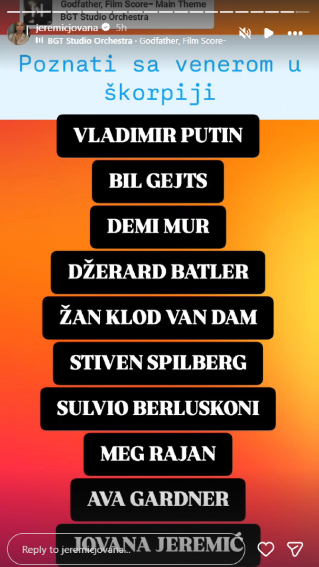 "Venera u Škorpiji: Vladimir Putin, Bil Gejts, Demi Mur, Žerar Batler, Žan Klod Van Dam, Stiven Spilberg, Silvio Berluskoni, Meg Rajan, Ava Gardner, Jovana Jeremić", napisala je voditeljka, koju pratioci na mrežama već nazivaju "kraljicom šera".