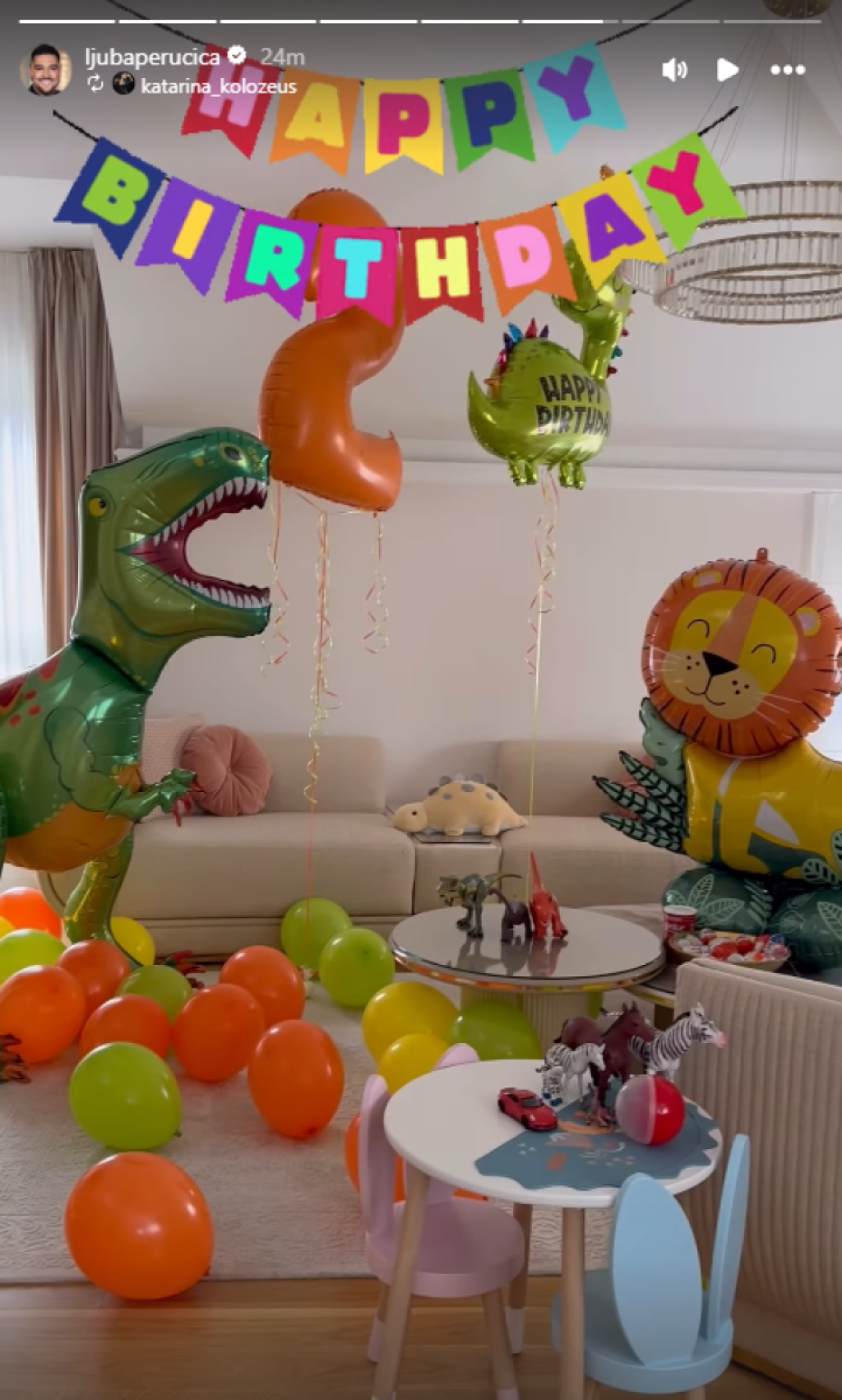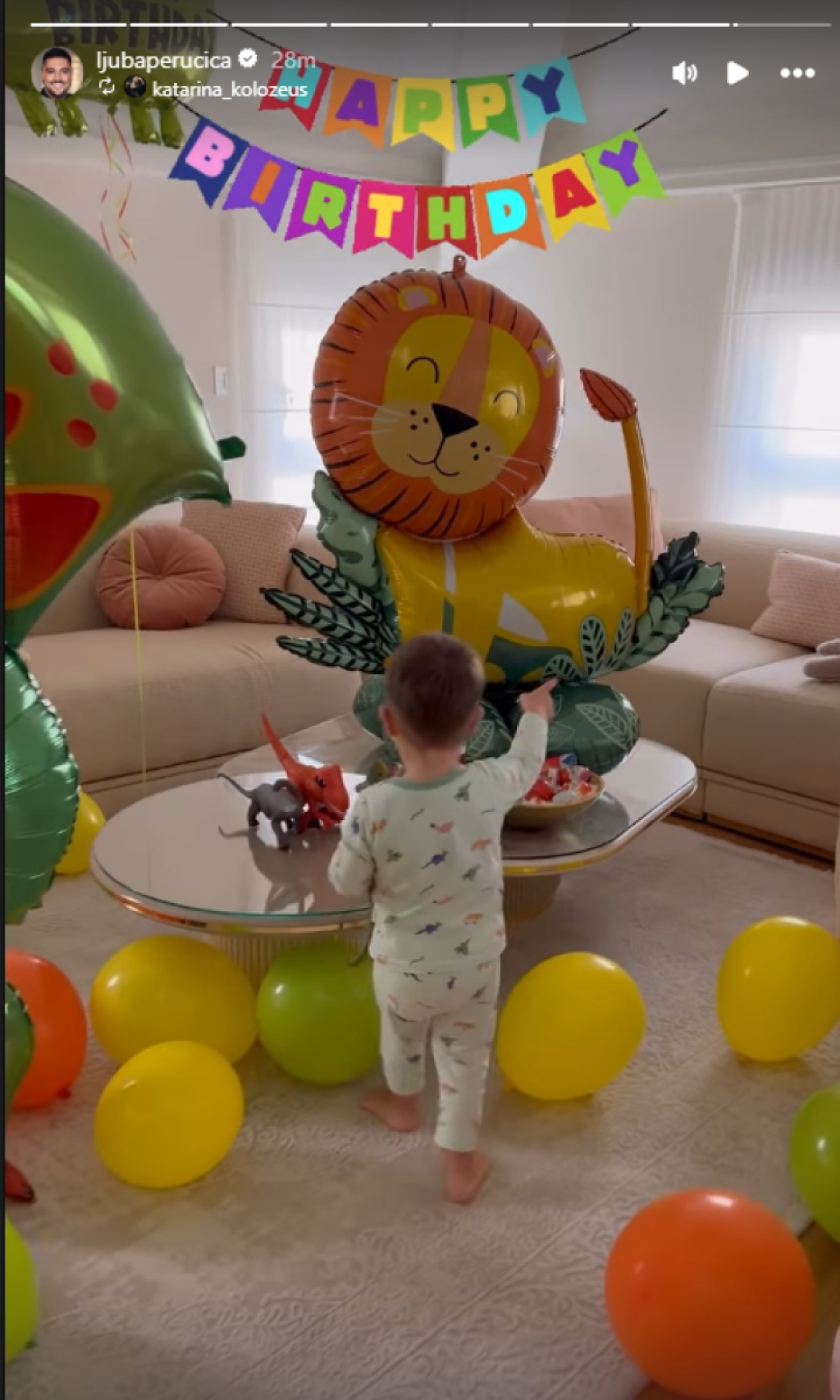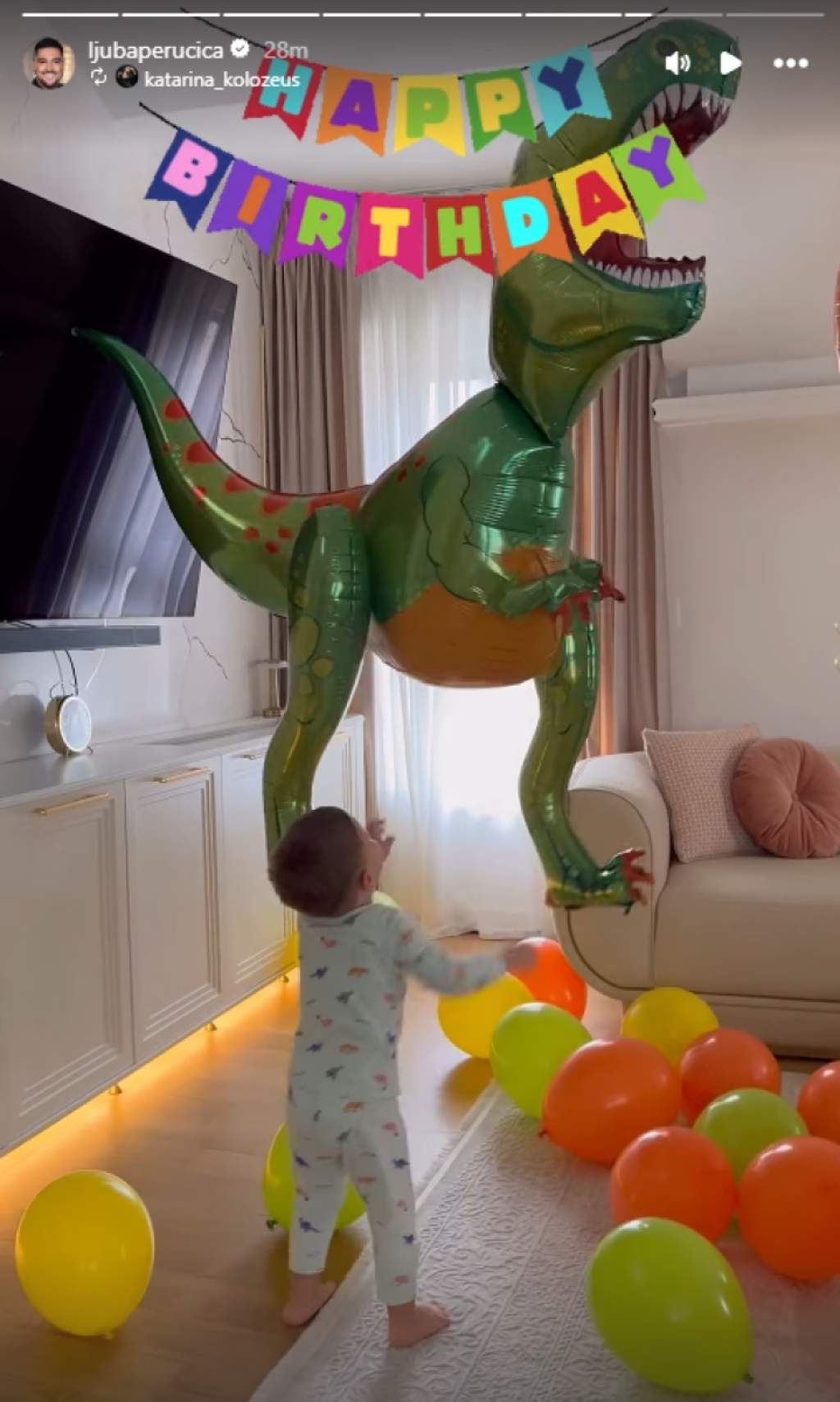 Ljuba je pokazao kako je zajedno sa suprugom ukrasio stan šarenim balonima, kao i balonima u obliku dinosaurusa, džungle i lavova. Ipak, glavni poklon bio je poseban, a u pitanju je mali motor za decu.
