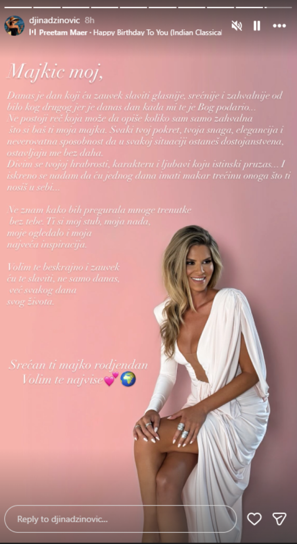 "Majkić moj, danas je dan koji ću zauvek slaviti glasnije, srećnije i zahvalnije od bilo kog drugog jer je danas dan kada mi te je Bog podario... Ne postoji reč koja može da opiše koliko sam samo zahvalna što si baš ti moja majka. Svaki tvoj pokret, tvoja snaga, elegancija i neverovatna sposobnost da u svakoj situaciji ostaneš dostojanstvena, ostavljaju me bez daha", napisala je Đina, a zatim nastavila: